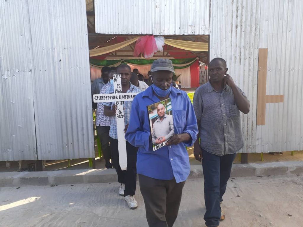 Baadhi ya Ndugu wa Marehemu Christopher Mfinanga wakiongoza msalaba na picha yake kuelekea kanisa la KKKT Kibaha kwajili ya kuaga mwili wa Marehemu kabla ya kusafirishwa kijijini kwao Ugweno, Usangi Same mkoani Kilimanjaro.