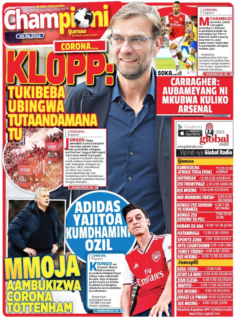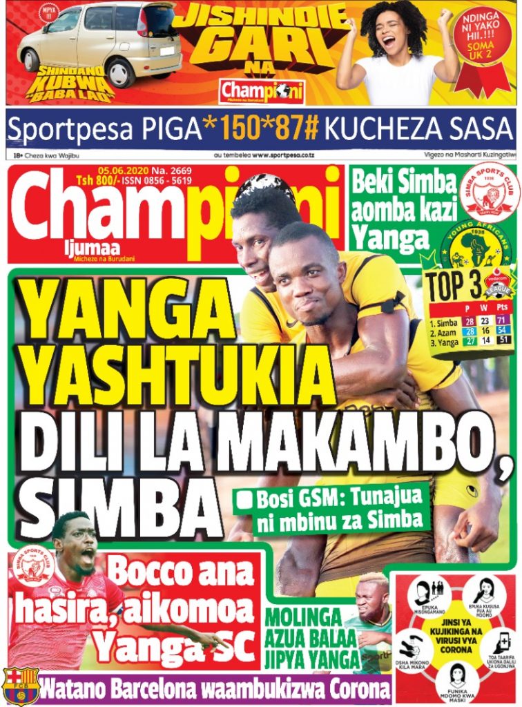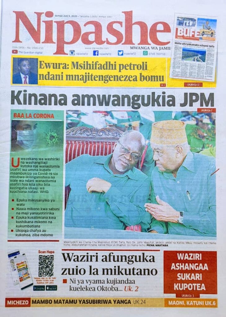 MagazetiPITIA VICHWA VYA HABARI KATIKA MAGAZETI YA LEO JUNE 5,2020 Last updated: 2020/06/05 at 6:18 AM Alex Sonna 5 years ago Share SHARE Alex Sonna June 5, 2020 June 5, 2020 Share this Article Facebook Twitter Email Print Previous Article RC SONGWE AFANYA ZIARA KWA KUWATEMBELEA WAKULIMA WA MAHINDI NA KAHAWA KATIKA MASHAMBA YAO Next Article BARAZA LA VETERINARI LAONYA MADAKTARI ‘FEKI’ KUHUDUMIA MIFUGO