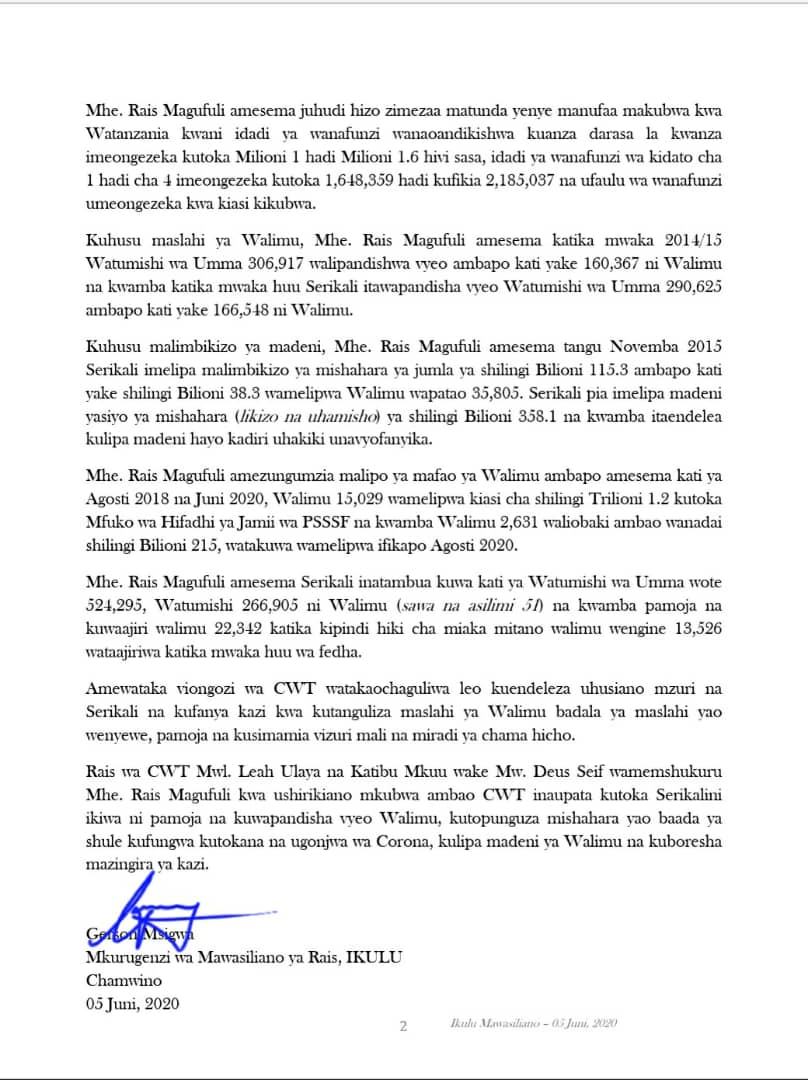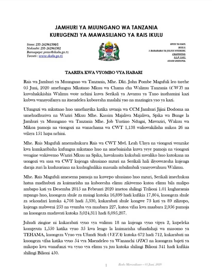Dkt. John Pombe Magufuli akizungumza na viongozi pamoja na waakilishi mbalimbali wa Chama cha Walimu CWT kabla ya kufungua Mkutano Mkuu wa Uchaguzi wa CWT uliofanyika katika uwanja wa Jamhuri jijini Dodoma leo tarehe 5 Juni 2020.