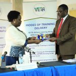 Waziri wa Nchi, Ofisi ya Waziri Mkuu anayeshughulikia Sera, Bunge, Kazi, Vijana, Ajira na Wenye Ulemavu Mhe. Jenista Mhagama (kulia) akikabidhi Cheti cha Pongezi kwa Bi. Ulumbi Shami ambaye ameteuliwa kuwakilisha Kundi Maalum la Walimu Wenye Ulemavu.