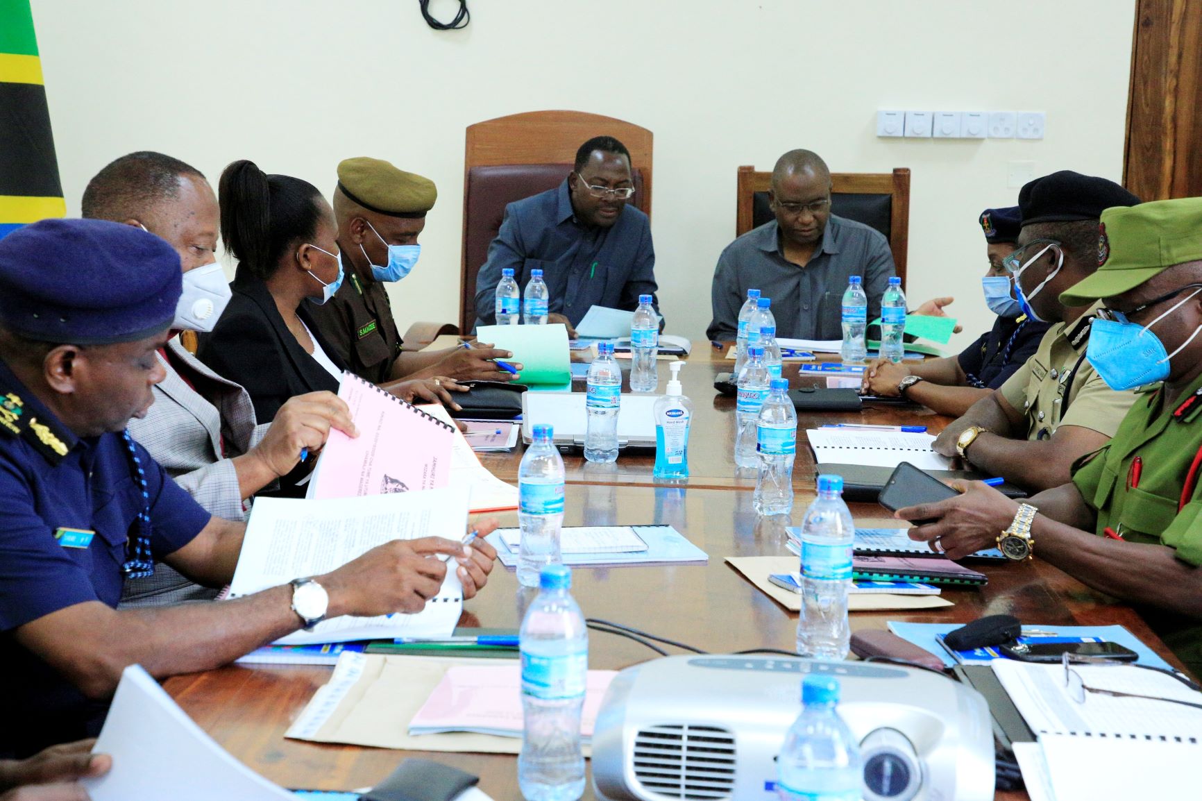 Waziri wa Mambo ya Ndani ya Nchi, George Simbachawene (kushoto meza kuu) akiongoza kikao cha Tume ya Jeshi la Polisi, Magereza na Uhamiaji inayoshughulikia masuala ya Kiutumishi na Kiutendaji wa Askari katika Majeshi hayo, katika Ukumbi wa Wizara hiyo, jijini Dodoma, leo. Kulia Meza Kuu ni Katibu Mkuu wa Wizara hiyo, Christophere Kadio.