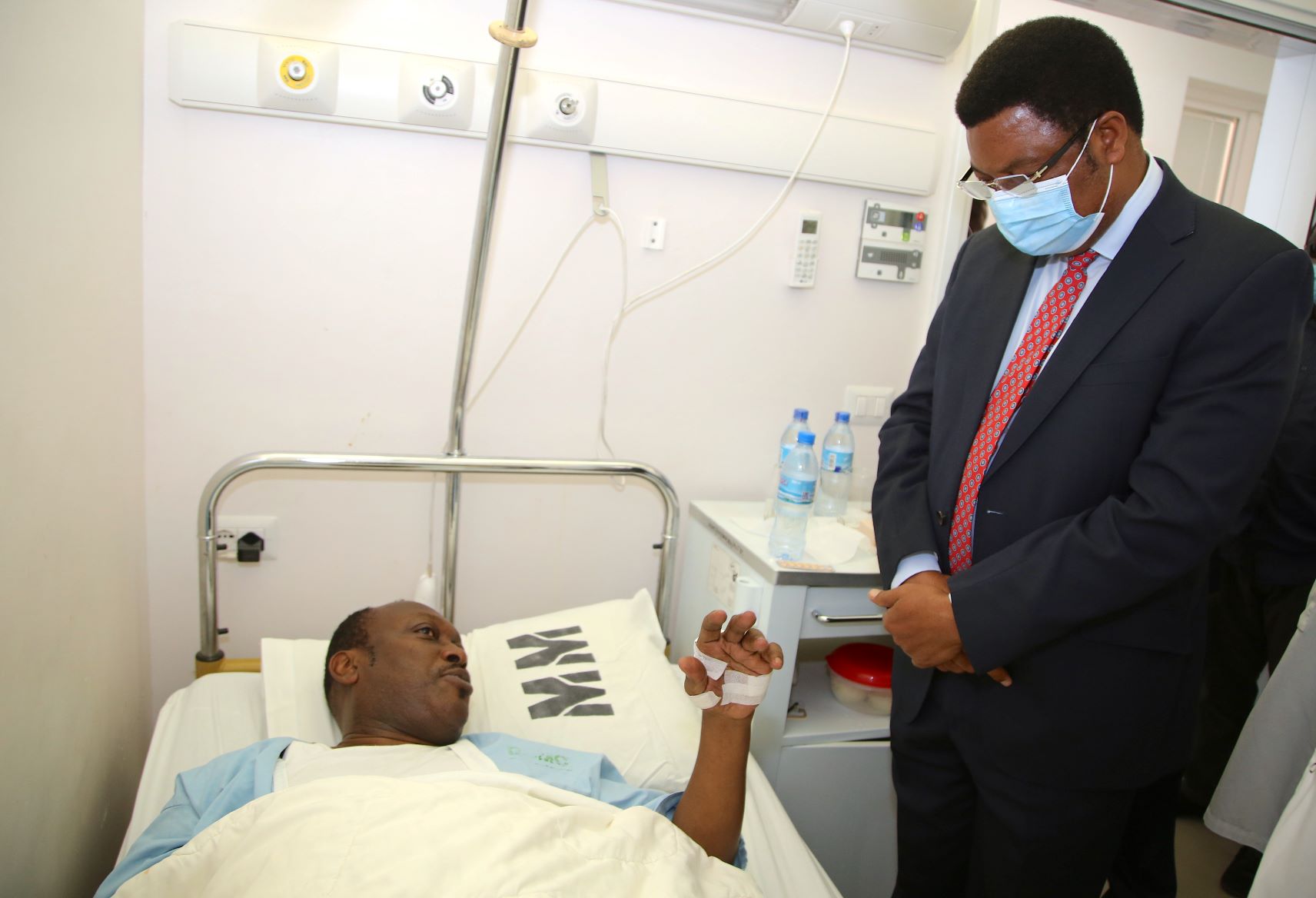 Waziri Mkuu, Kassim Majaliwa akimpa pole Kiongozi wa Upinzani Bungeni, Freeman Mbowe ambaye amelazwa katika hospitali ya Ntyuka jijini Dodoma, kwa matibabu Juni 9, 2020. Mbowe anatibiwa majeraha aliyoyapata baada ya kushambuliwa na watu ambao bado hawajajulikana wakati akiingia nyumbani kwake jijini Dodoma usiku wa kuamkia leo. (Picha na Ofisi ya Waziri Mkuu)