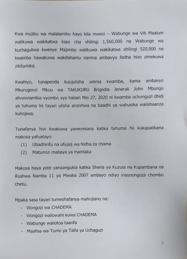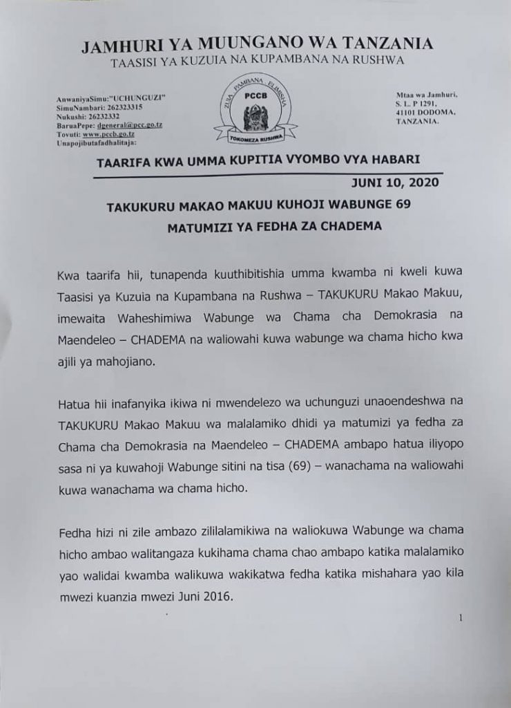 MchanganyikoWABUNGE 69 CHADEMA KUHOJIWA NA TAKUKURU LEO DODOMA Last updated: 2020/06/10 at 5:26 AM Alex Sonna 5 years ago Share SHARE Alex Sonna June 10, 2020 June 10, 2020 Share this Article Facebook Twitter Email Print Previous Article WAKAZI LAKI 521,897 WAISHIO VIJIJINI KUPELEKEWA HUDUMA YA MAWASILIANO Next Article TTB YAKUTANA NA MABALOZI KUWEKA MIKAKATI YA KUTANGAZA UTALII KWENYE UKANDA WA ASIA NA AUSTRALASIA