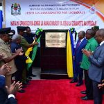 Rais wa Jamhuri ya Muungano wa Tanzania Mheshimiwa Dkt. John Pombe Magufuli akiwa na Waziri wa TAMISEMI Selemani Jafo wakivuta utepe kuashiria uwekaji wa jiwe la Msingi mradi wa ujenzi wa Barabara za lami zenye jumla ya km 51.2 katika mji wa Serikali (Mtumba) mkoani Dodoma leo tarehe 11 Juni 2020.