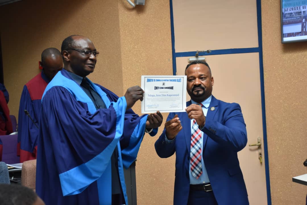 Katibu Mkuu wa Jumuiya ya Tawala za Mikoa na Serikali za Mitaa (ALAT), Bwana Elirehemu Kaaya akimkabizi cheti cha shukrani Mkurugenzi Aron Kagurumjuli kutokana na umahiri wa utendaji kazi wake.