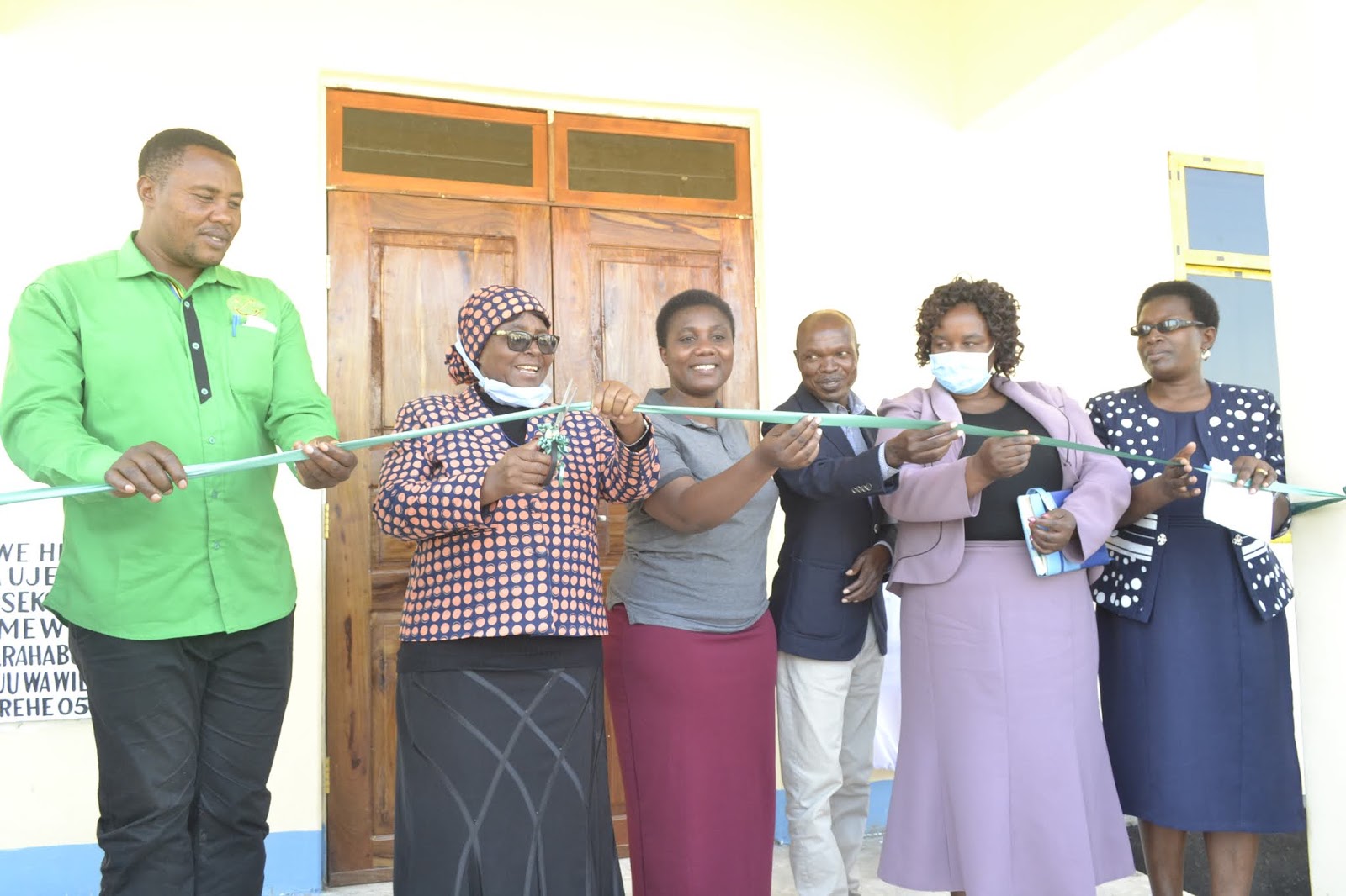 Mkuu wa Mkoa wa Singida, Dk. Rehema Nchimbi (wa pili kushoto) akikata utepe kuashiria uzinduzi wa Bweni la Wanafunzi wa Kike wa Shule ya Sekondari ya Kinangali. Kutoka kulia ni Katibu Tawala wa mkoa huo, Dk. Angelina Lutambi, Afisa Elimu Mkoa wa Singida, Mwalimu Nelasi Mulungu, Mkurugenzi wa Halmashauri ya Wilaya ya Manyoni, Charles Fussi, Mkuu wa Wilaya ya Manyoni, Rahabu Solomoni na Mwenyekiti wa Chama Cha Mapinduzi (CCM) Wilaya ya Manyoni, Jumanne Makhanda.