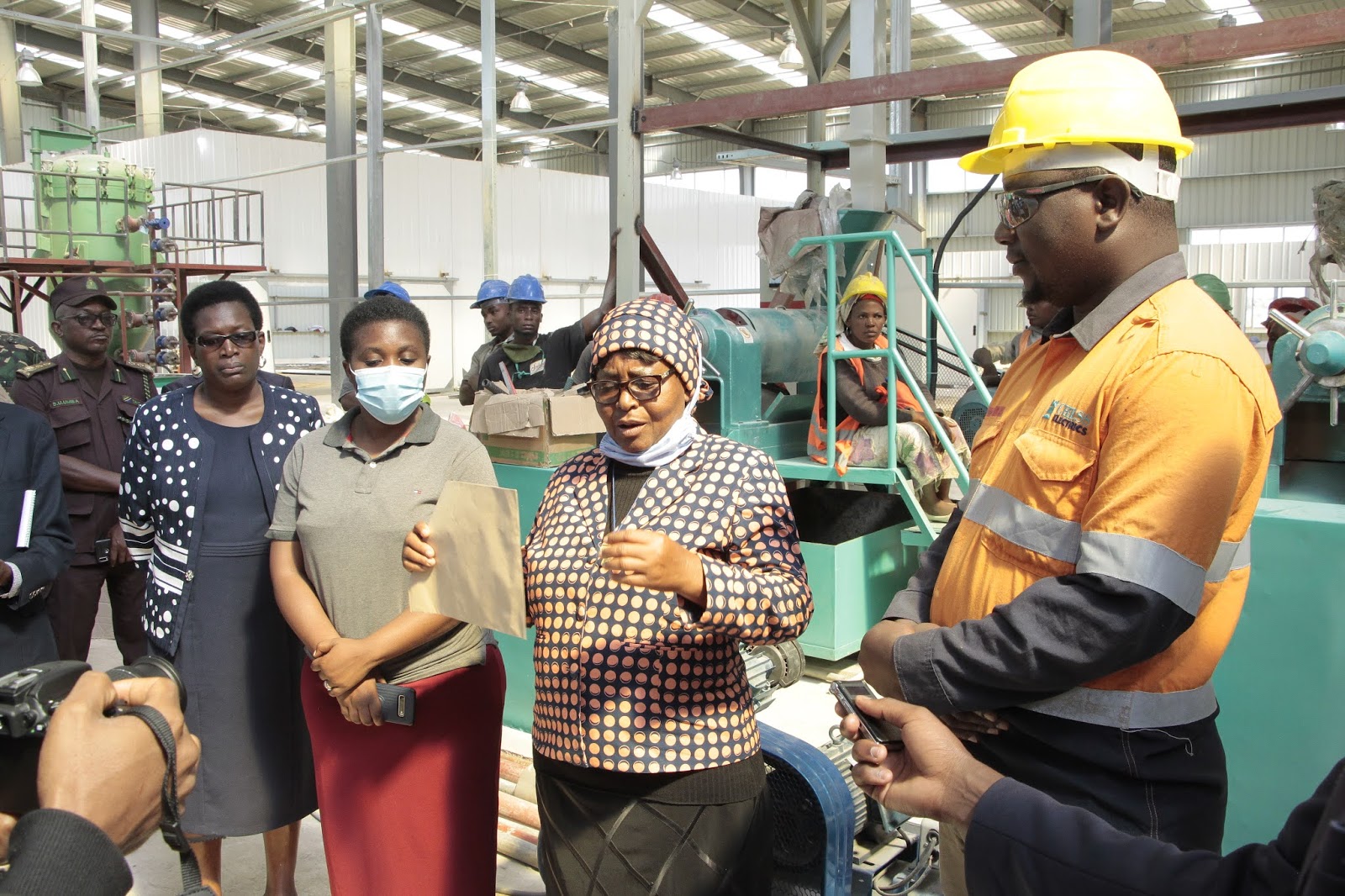 Mkuu wa Mkoa wa Singida, Dk. Rehema Nchimbi, akizungumza wakati akikagua ujenzi wa kiwanda cha kuchakata alizeti. Kulia ni Meneja wa kiwanda hicho.