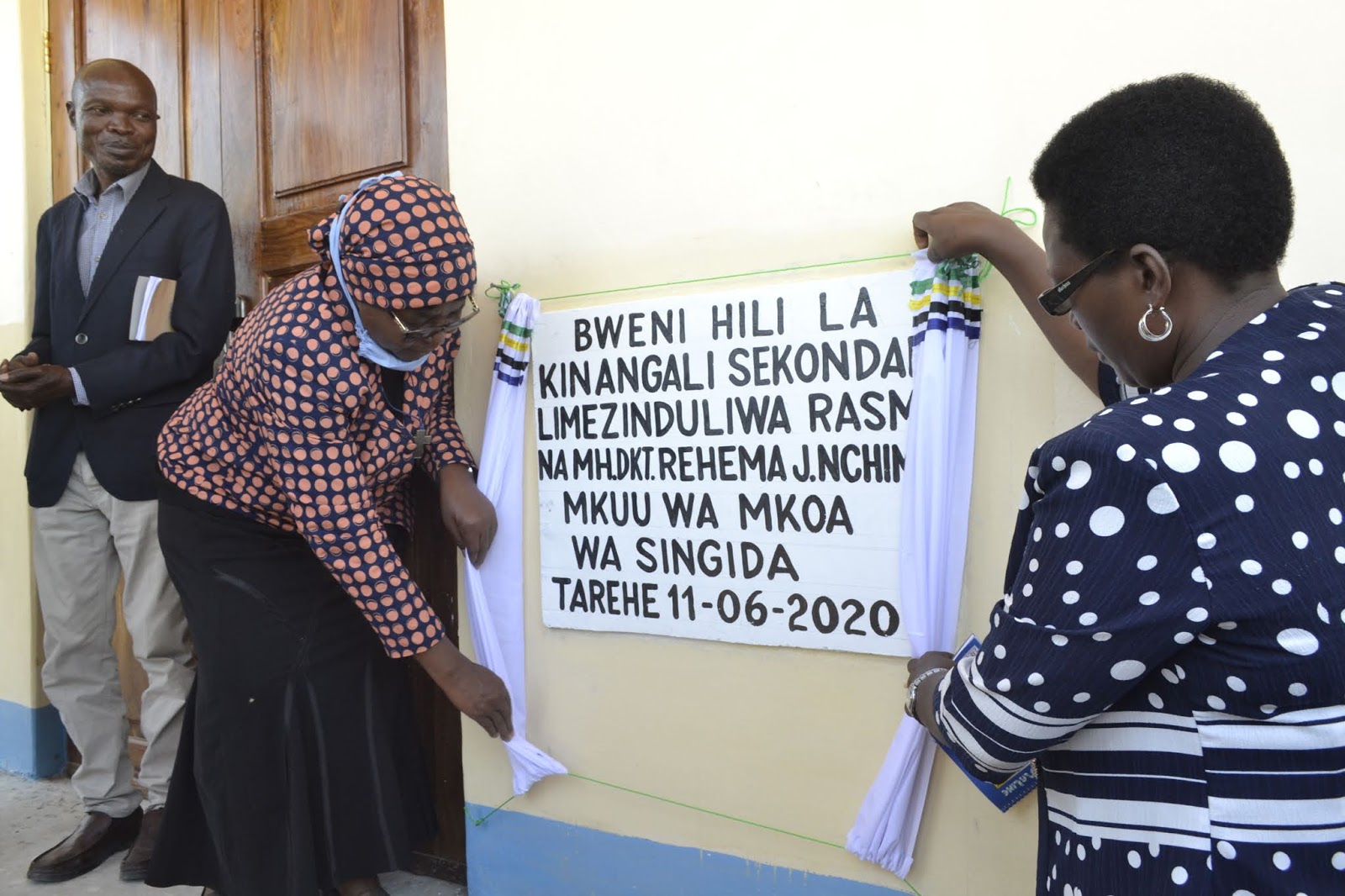Mkuu wa Mkoa wa Singida, Dk. Rehema Nchimbi (katikati) akivuta pazia kuashiria uzinduzi wa Bweni la Wanafunzi wa Kike wa Shule ya Sekondari ya Kinangali mkoani hapa jana. Kulia ni Katibu Tawala wa mkoa huo, Dk. Angelina Lutambi na kushoto ni Mkurugenzi wa Halmashauri ya Wilaya ya Manyoni, Charles Fussi.
