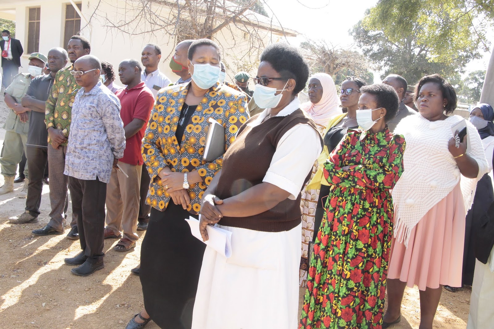 Wafanyakazi wa Hospitali ya Wilaya Manyoni wakiwa na viongozi mbalimbali wakati wakimsikiliza Mkuu wa Mkoa wa Singida Dk. Nchimbi.