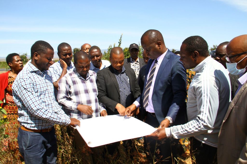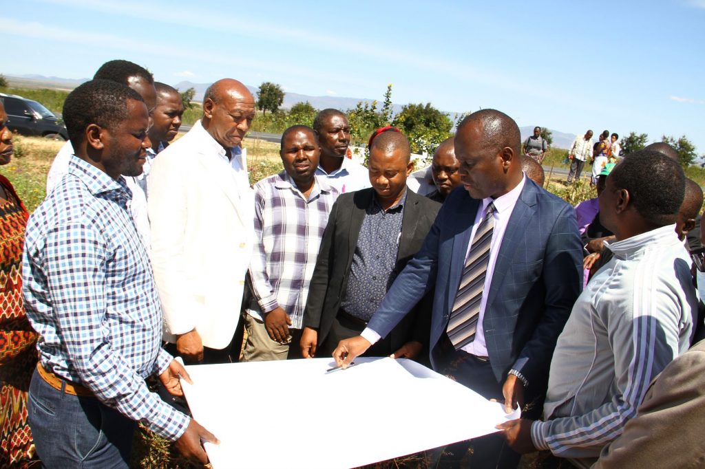 Katibu Mkuu Wizara ya Kilimo Bwana Gerald Kusaya akiangalia ramani ya ujenzi wa Kituo Mahiri (Centre of Excellence) kwa ajili Udhibiti wa Sumukuvu mara baada ya kutembelea na kukagua eneo hilo.