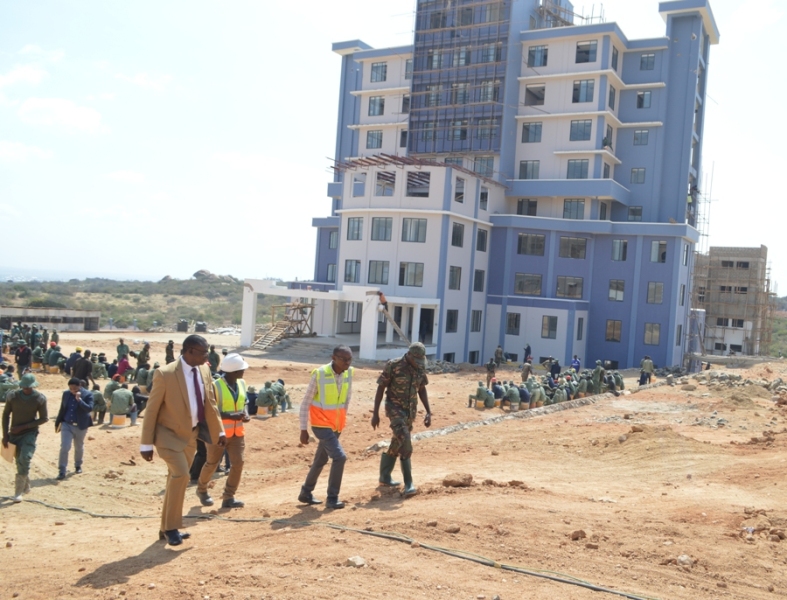 Katibu Mkuu Ofisi ya Waziri Mkuu (Waziri Mkuu na Bunge) Bw. Tixon Nzunda pamoja na timu aliyoongozana nayo wakiwa katika ziara ya kukagua maendeleo ya ujenzi wa jengo la ofisi ya Tume ya Uchaguzi (NEC) lililopo eneo la Njedengwa Jijini Dodoma.