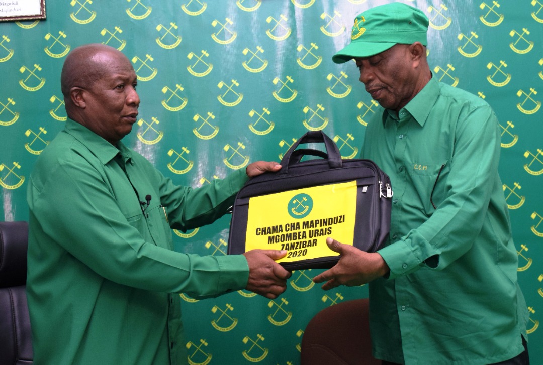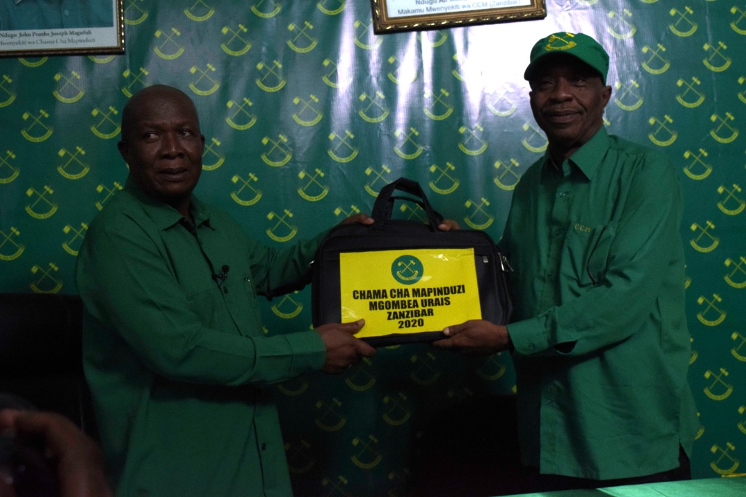 Katibu wa Kamati maalumu Idara ya Oganaizesheni Zanzibar, Cassian Gallo’s, akimkabidhi fomu za kueania kuteuliwa kugombea nafasi ya Urais Zanzibar, Mohammed Hija Mohammed, katika Ofisi za Ccm Kisiwa Ndui mjini Unguja leo. (Picha na Muhidin Sufiani).
