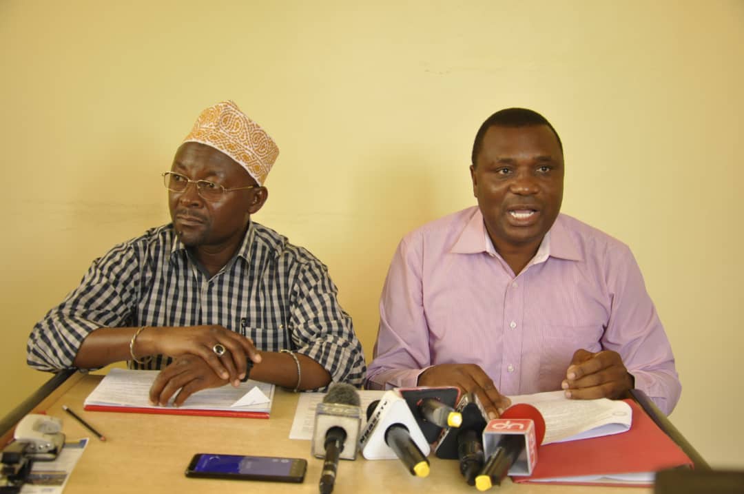 Katibu Mkuu wa Chama cha Wafugaji Tanzania, Magembe Makoye (Kulia) akifafanua jambo kwa Naibu Katibu Mkuu wa Wizara ya Mambo ya Ndani ya Nchi, Ramadhani Kailima (Kushoto) walipokuwa katika Mkutano na waandishi wa habari uliofanyika, jijini Dodoma.