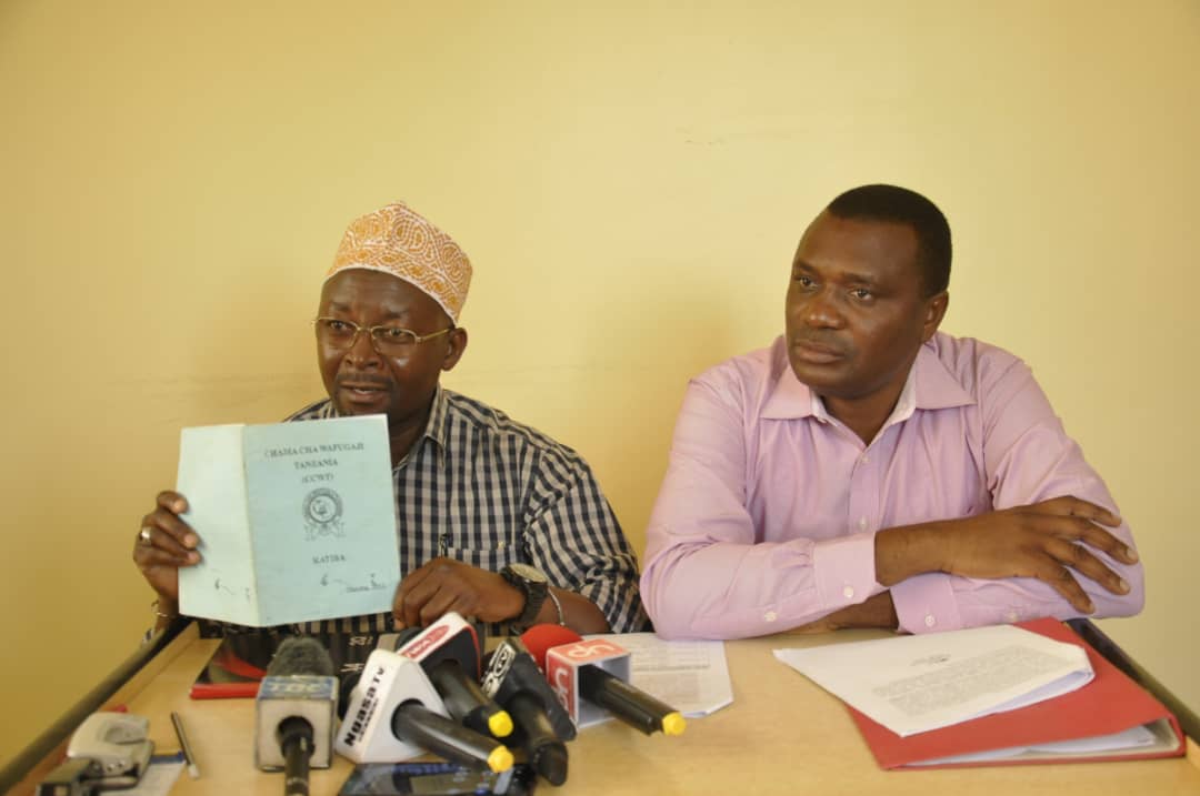 Naibu Katibu Mkuu wa Wizara ya Mambo ya Ndani ya Nchi, Ramadhani Kailima(Kushoto) akionyesha Katiba ya Chama cha Wafugaji Tanzania (CCWT) inayoelezea masharti ya namna mtu anavyotakiwa kujiunga na uanachama wa Chama hicho, Katiba hiyo ilipitishwa na wanachama wa Chama hicho 26 Oktoba 2013 katika Mkutano wao Mkuu uliofanyika Jijini Dodoma. Kailima, amezungumza katika Mkutano na waandishi wa habari uliofanyika, Dodoma leo. Kulia ni Katibu Mkuu wa Chama cha Wafugaji Tanzania, Magembe Makoye.