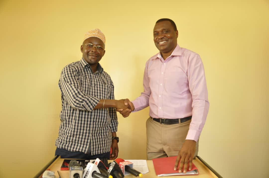 Katibu Mkuu wa Chama cha Wafugaji Tanzania, Magembe Makoye (Kulia) akifafanua jambo kwa Naibu Katibu Mkuu wa Wizara ya Mambo ya Ndani ya Nchi, Ramadhani Kailima (Kushoto) walipokuwa katika Mkutano na waandishi wa habari uliofanyika, jijini Dodoma.