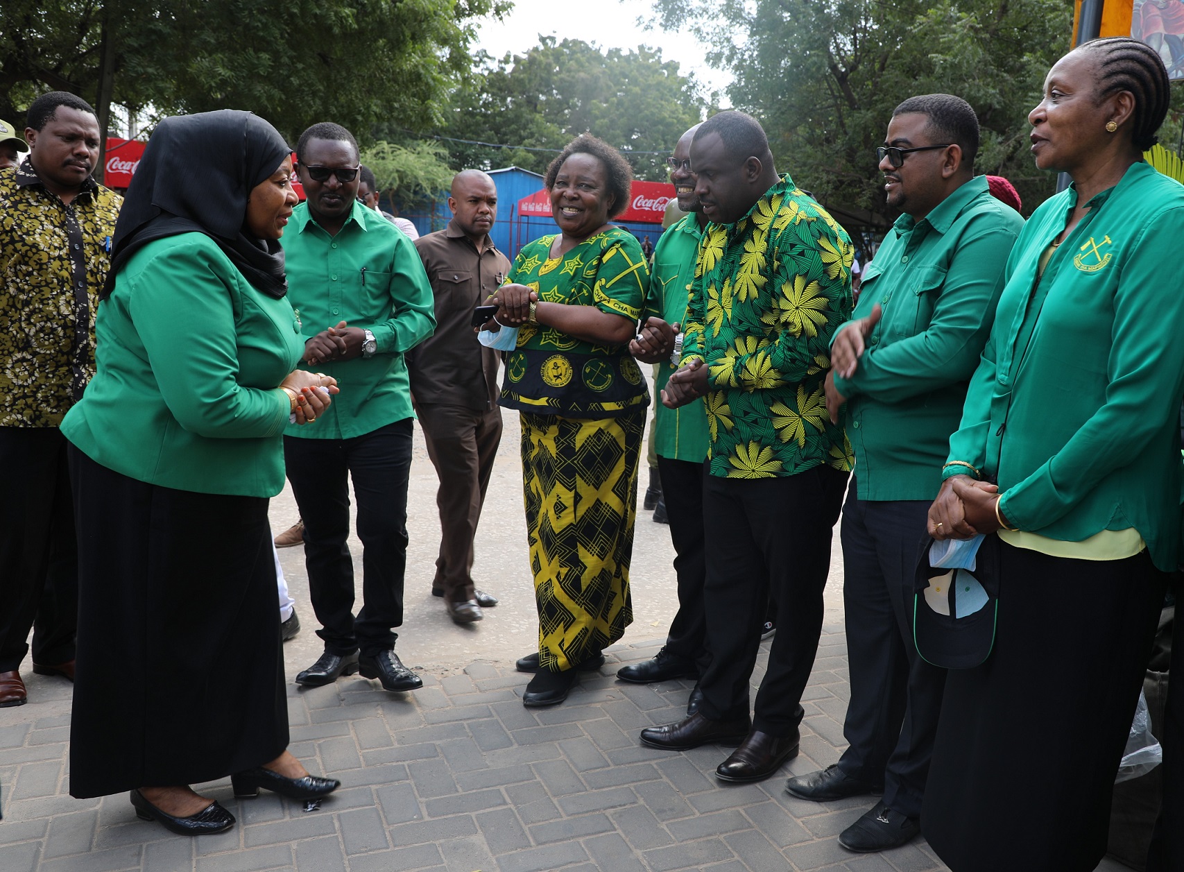 Mjumbe wa Kamati Kuu ya Halmashauri Kuu ya CCM Taifa na Mlezi wa CCM Mkoa wa Dar es salaam na Makamu wa Rais wa Jamhuri ya Muungano wa Tanzania Mhe. Samia Suluhu Hassan, akisalimiana kwa Ishara na Viongozi wa CCM Mkoa wa Dar es salaam alipowasili katika Ukumbi wa Urafiki Jijini Dar es salaam leo Juni 20,2020 kwa ajili ya kufungua Kongamano la Umoja wa Vijana wa CCM Tawi la Chuo Kikuu cha Dar es salaam lenye lengo la kumpongeza Rais Dkt. John Pombe Magufuli kwa kazi nzuri anayoifanya katika kipindi chake cha Uongozi.