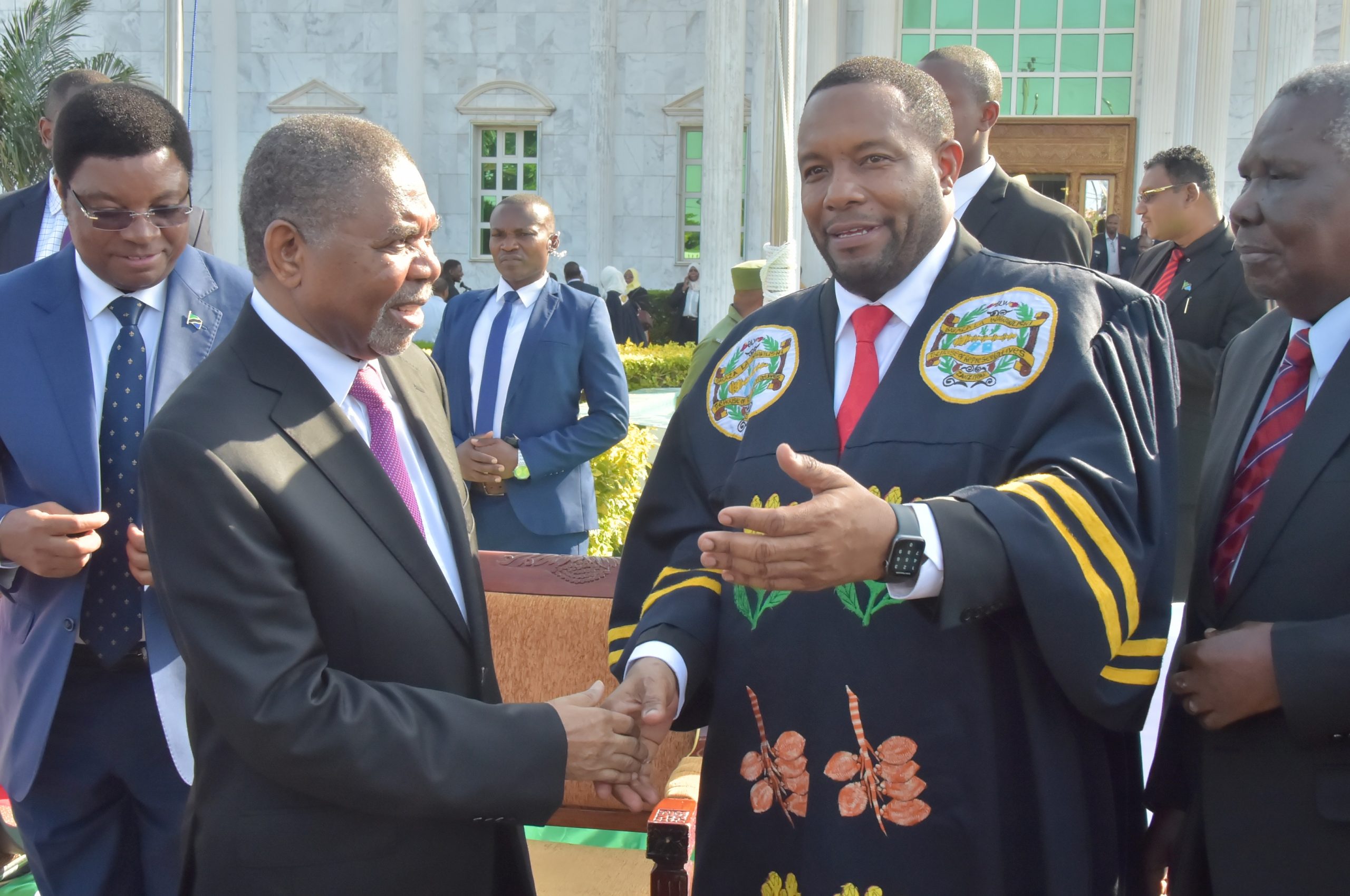 Rais wa Zanzibar na Mwenyekiti wa Baraza la Mapinduzi Dk.Ali Mohamed Shein (katikati) akiagana na Spika wa Baraza la Wawakilishi Zanzibar Mhe.Zubeir Ali Maulid pamoja na Viongozi mbali mbali baada ya kumalizika kwa sherehe za kulivunja Baraza la 9 la Wawakilishi Zanzibar,katika Ukumbi wa Baraza hilo leo Chukwani nje ya Mji wa Zanzibar.[Picha na Ikulu] 20/06/2020.