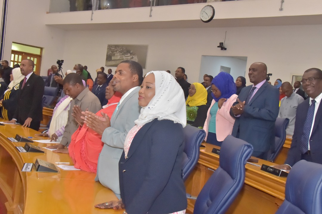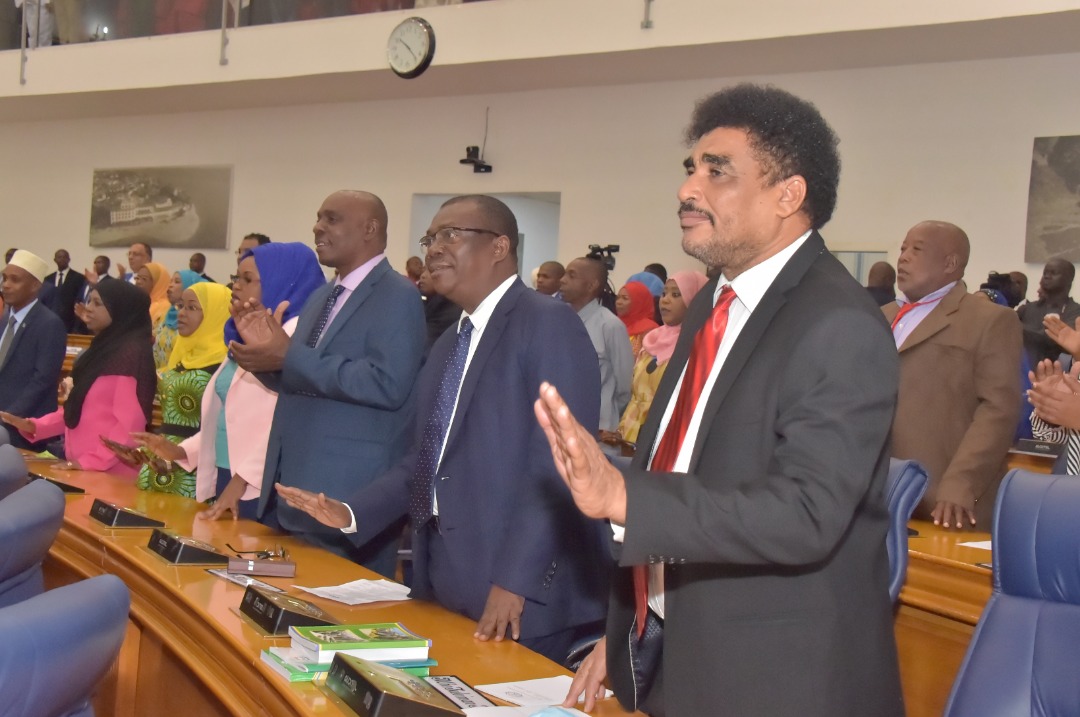 Baadhi ya Wajumbe wa Baraza la Wawakilishi wakimkaribisha Rais wa Zanzibar na Mwenyekiti wa Baraza la Mapinduzi Dk.Ali Mohamed Shein(hayupo pichani) akiwa Mgeni rasmi katika Sherehe za kulivunja Baraza la 9 la Wawawakilishi zilizofanyika leo Chukwani Nje ya Mji wa Zanzibar. [Picha na Ikulu.] 20/06/2020.