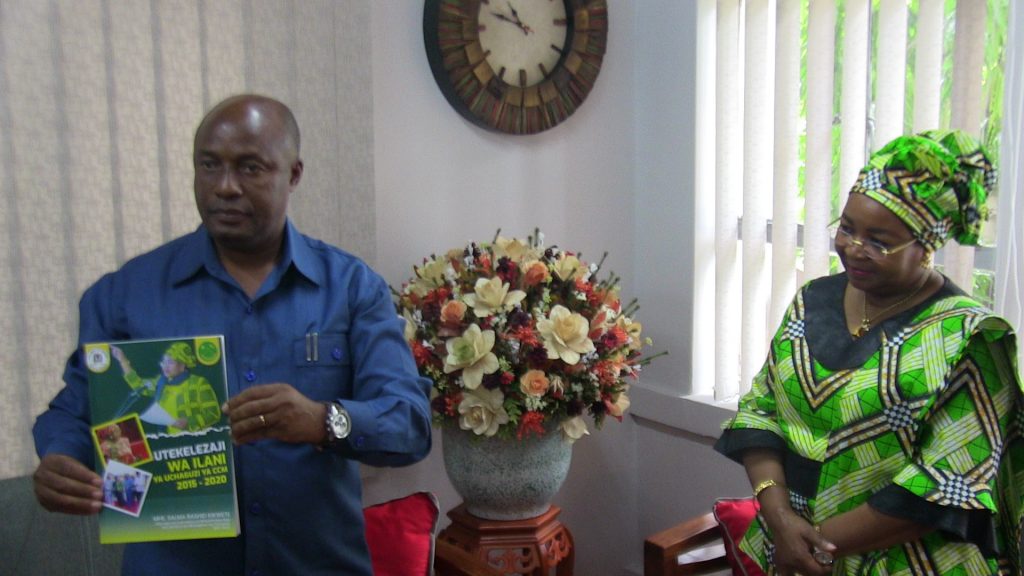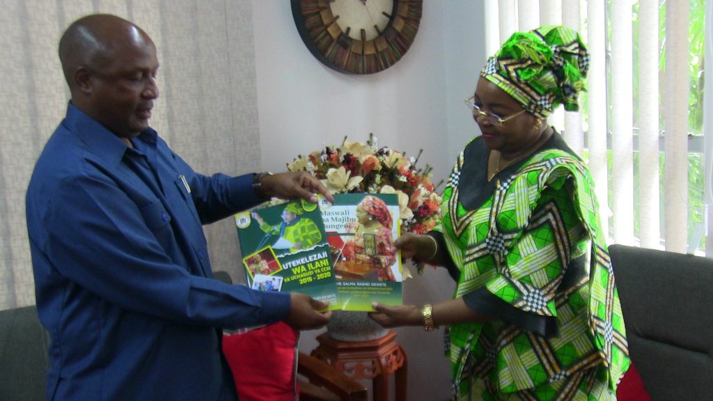 Mkuu wa Mkoa wa Pwani Mhandisi Evarist Ndikilo kushoto akionyesha kitabu chenye taarifa ya utekelezaji wa ilani ya Uchaguzi wa Chama cha mapinduzi (CCM) Kwa kipindi cha kuanzia mwaka 2015/2020 ambayo imetekelezwa na Mke wa Rais wa wamu ya nne Mama Salma Kikwete ambaye alikuwa Mbunge wa kuteuliwa.