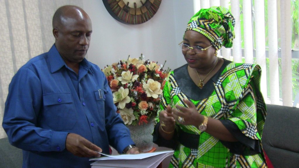 Mke wa Rais wa awamu ya nne Mama Salma Kikwete kulia akifafanua jambo kwa Mkuu wa Mkoa wa Pwani Mhandisi Evarist Ndikilo mara baada ya kumkabidhi ripoti yake ya utekelezaji wa Ilani ya uchaguzi kwa kipindi cha mwaka 2015/2020