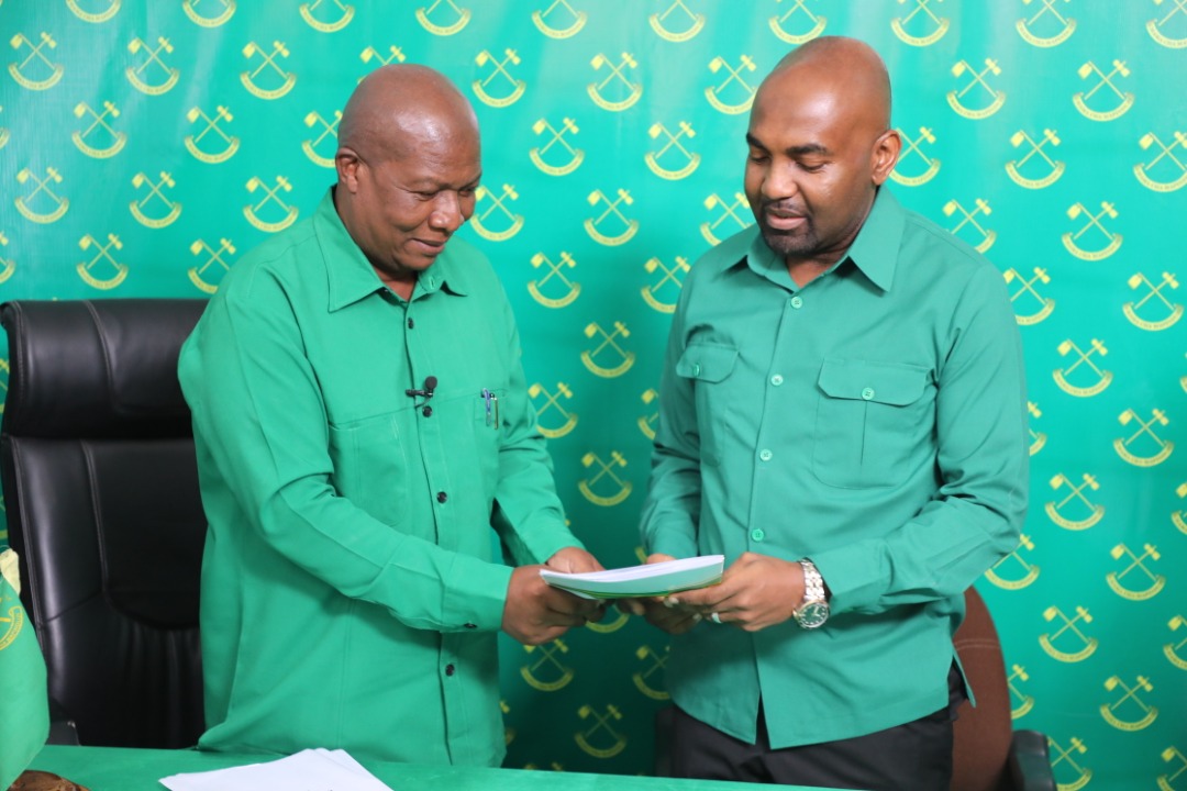 Mbunge wa Jimbo la Kikwajuni na Naibu Waziri wa Mambo ya Ndani ya Nchi, Mhandisi Hamad Masauni akikabidhiwa maelekezo maalumu na Katibu Kamati Maalumu ya NEC na Idara ya Oganaizesheni,Garosi Nyimbo baada ya kufika Afisi Kuu ya Chama cha Mapinduzi(CCM) kuomba kuteuliwa na CCM kugombea nafasi ya Urais wa Zanzibar, fomu hiyo amechukua leo katika Afisi ya CCM Kisiwandui Zanzibar.Picha na Abubakari Akida