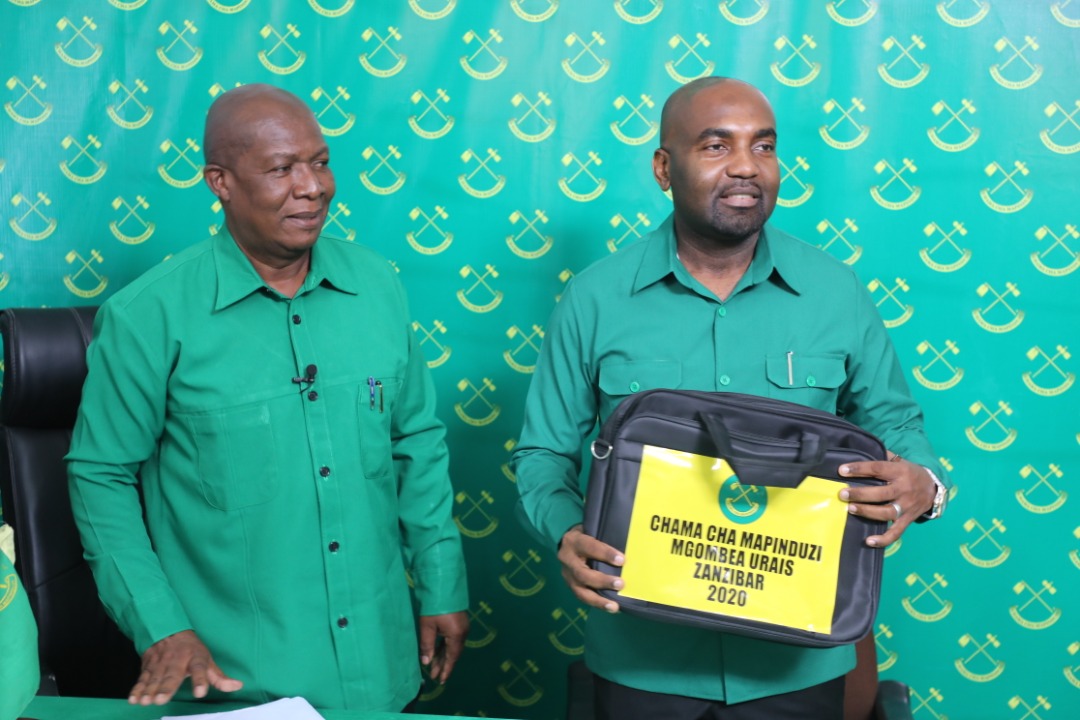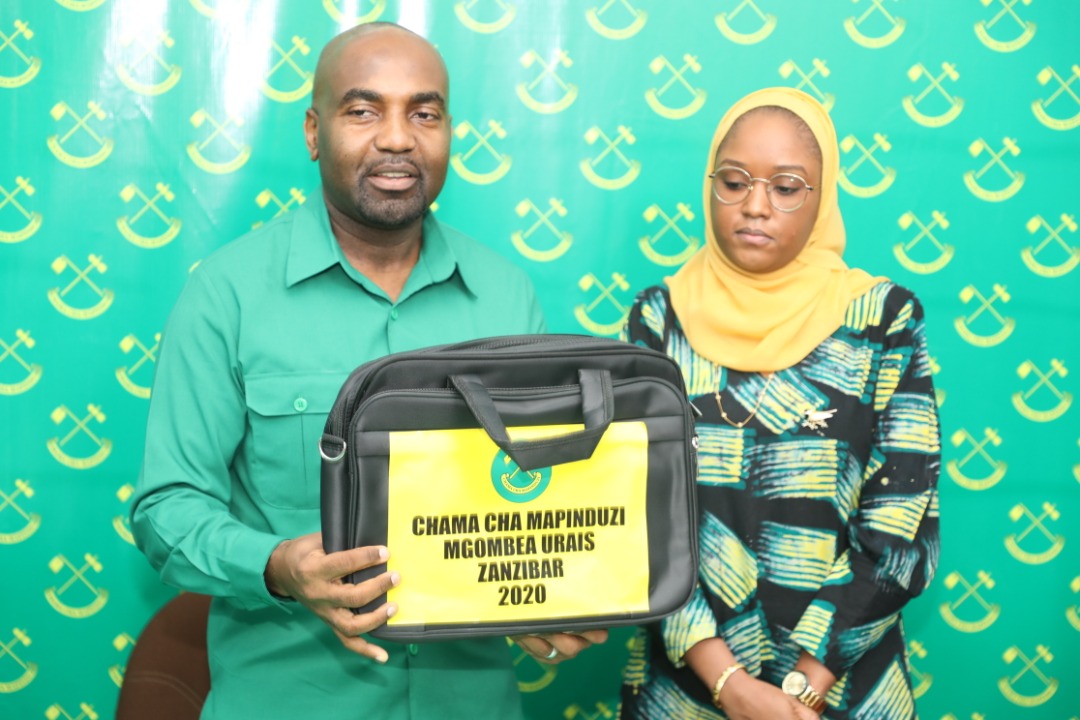 Mbunge wa Jimbo la Kikwajuni na Naibu Waziri wa Mambo ya Ndani ya Nchi, Mhandisi Hamad Masauni akionyesha mkoba wenye fomu ya kuomba kuteuliwa na Chama cha Mapinduzi (CCM), kugombea nafasi ya Urais wa Zanzibar.Kushoto ni Katibu Kamati Maalumu ya NEC na Idara ya Oganaizesheni,fomu hiyo amechukua leo katika Afisi ya CCM Kisiwandui Zanzibar.Picha na Abubakari Akida