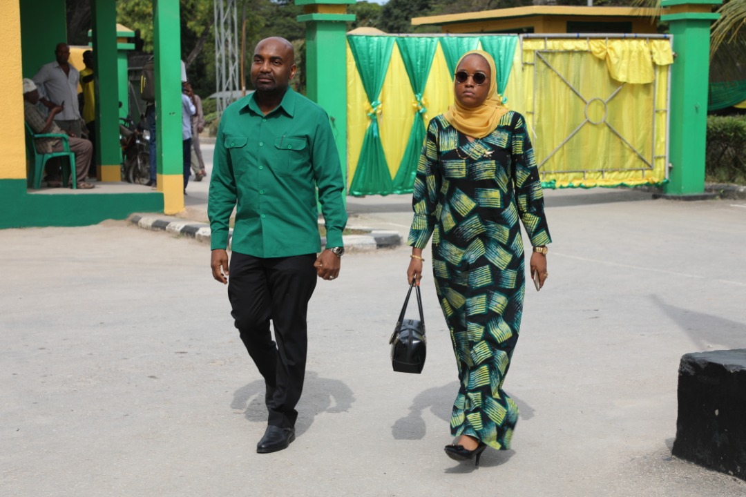 Mbunge wa Jimbo la Kikwajuni na Naibu Waziri wa Mambo ya Ndani ya Nchi, Mhandisi Hamad Masauni akiongozana na mkewe Thania Abdulla(kulia) wakati akiwasili Afisi Kuu ya Chama cha Mapinduzi(CCM),kuchukua fomu ya kuomba ridhaa ya CCM kuteuliwa kugombea nafasi ya Urais wa Zanzibar.Picha na Abubakari Akida