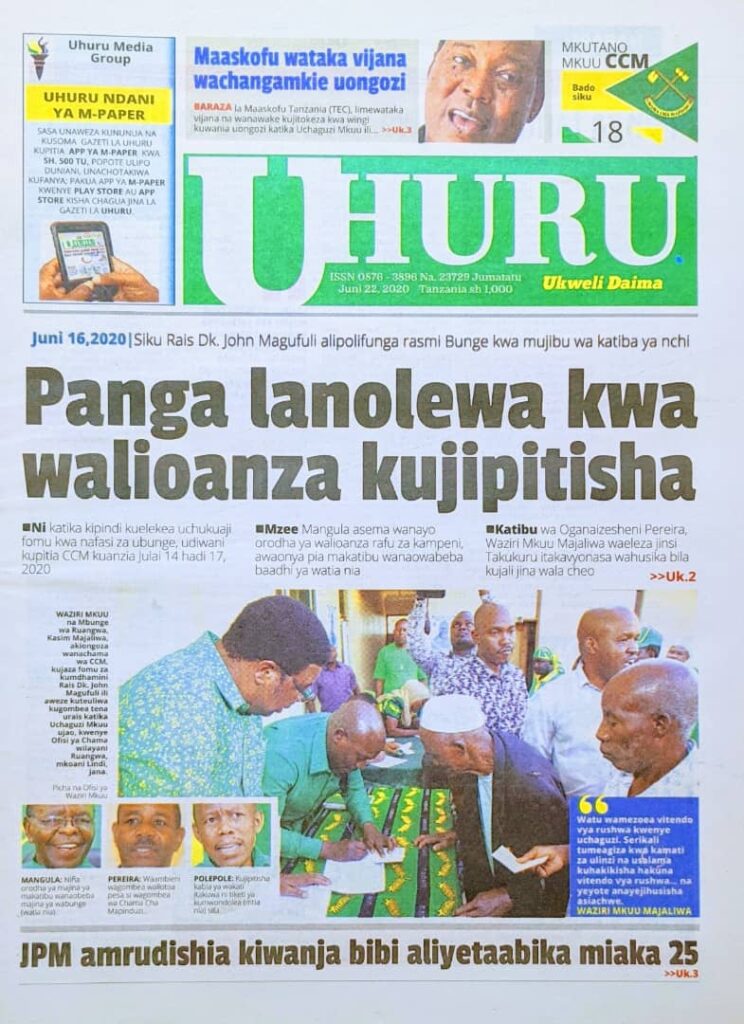 MagazetiPITIA VICHWA VYA HABARI KATIKA MAGAZETI YA LEO JUNE 22,2020 Last updated: 2020/06/22 at 3:48 AM Alex Sonna 6 years ago Share SHARE Alex Sonna June 22, 2020 June 22, 2020 Share this Article Facebook Twitter Email Print Previous Article WANACHAMA 2,565 WAJITOKEZA KUMDHAMINI DKT. MAGUFULI RUANGWA Next Article SERIKALI YALETA SULUHU KATI YA WAFANYAKAZI NA MKANDARASI