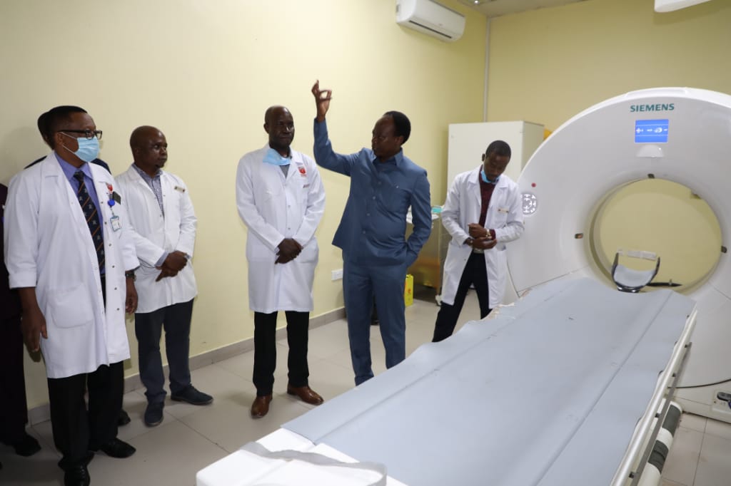 Naibu Waziri wa Afya Dkt Godwn Mollel akikagua mtambo wa kisasa wa CT Scan wa MOI ambo umenunuliwa na kusimikwa na Serikali ya awamu ya Tano