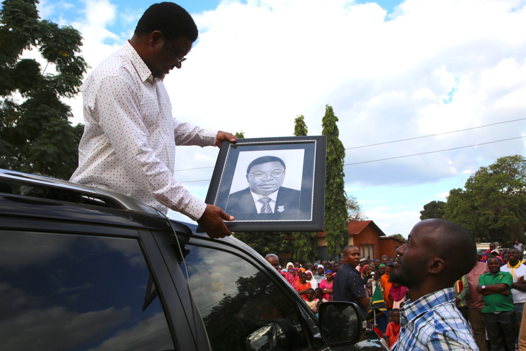 Waziri Mkuu, Kassim Majaliwa akitazama picha yake iliyochorwa na Tabibu wa Meno wa Kituo cha Afya cha Kingorwila Morogoro, Sanjame Kayoka (kulia) wakati alipohutubia mkutano wa hadhara katika Kata ya Nachingwea,Wilayani Ruangwa Juni 24, 2020.