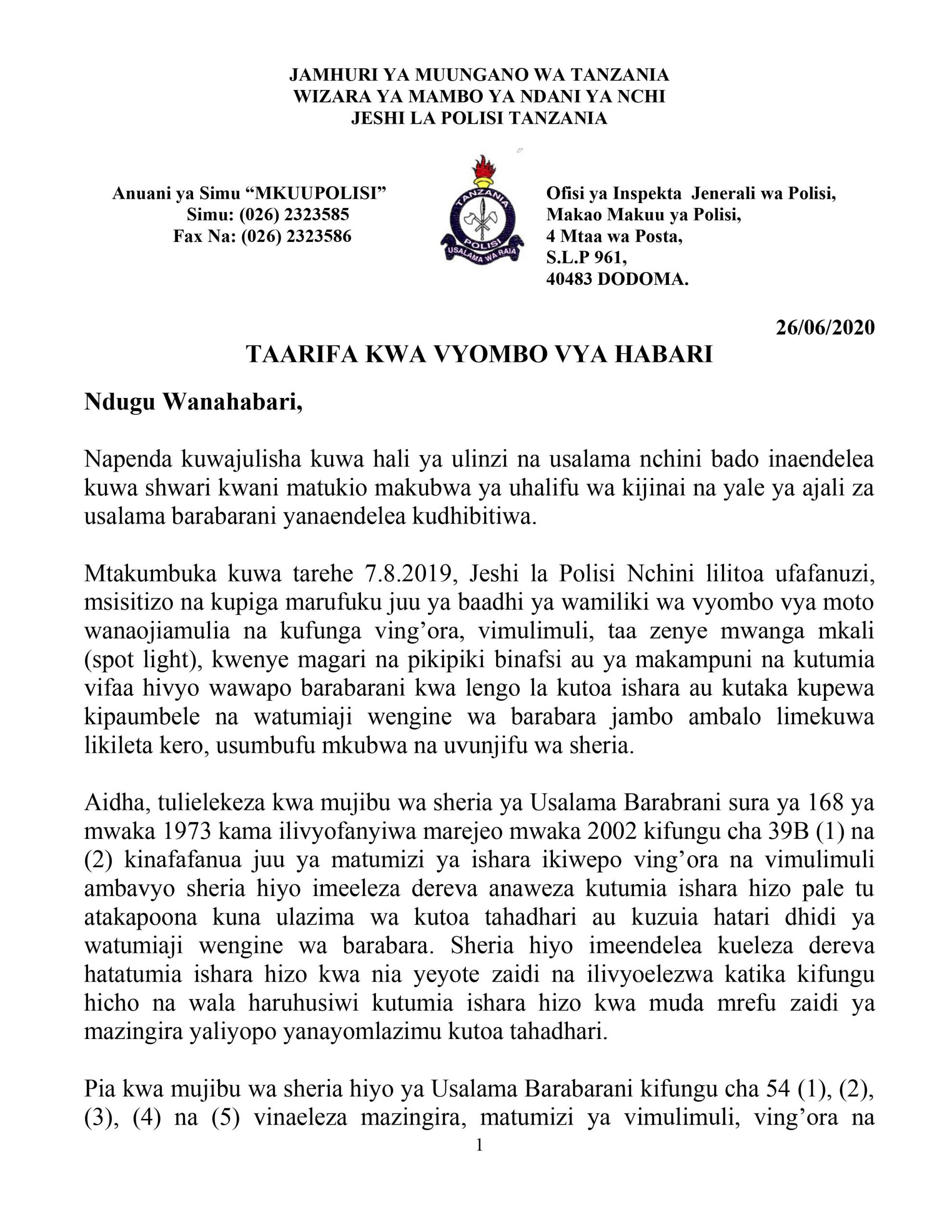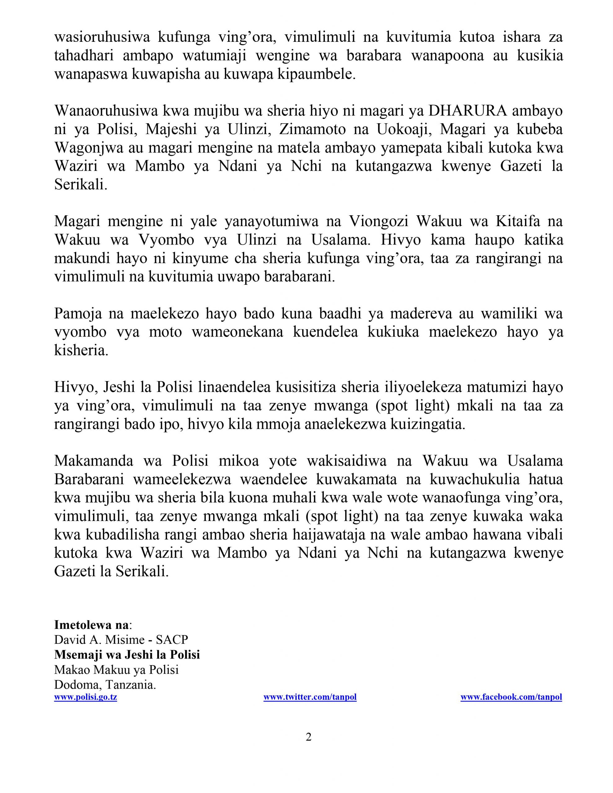 MchanganyikoJESHI LA POLISI LAPIGILIA MSUMARI KWA WANAOFUNGA VING’ORA KWENYE MAGARI YAO BILA KUWA NA RUKSA KUTOKA KWA WAZIRI WA MAMBO YA NDANI Last updated: 2020/06/26 at 4:02 PM joseph 6 years ago Share SHARE joseph June 26, 2020 June 26, 2020 Share this Article Facebook Twitter Email Print Previous Article NAIBU WAZIRI WA VIWANDA NA BIASHARA AFUNGA MAFUNZO YA MAAFISA BIASHARA NA TEHAMA. Next Article MALIPO YA ADA ZA MWAKA KWA JUMUIYA ZA KIJAMII NA TAASISI ZA DINI ZILIZOSAJILIWA NA MSAJILI WA JUMUIYA, WIZARA YA MAMBO YA NDANI YA NCHI