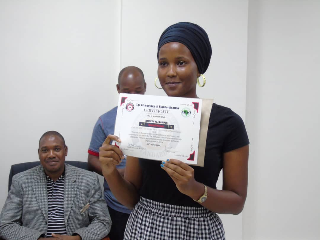 Mshindi wa kwanza shindano la uandishi insha juu ya maswala ya viwango Bi.Herieth Alexander akionesha cheti alichotunukiwa kama mshindi wa shindano hilo katika hafla ya utoaji vyeti kwa washindi lililofanyika leo Makao Makuu ya Shirika la Viwango Tanzania TBS, Jijini Dar es Salaam.