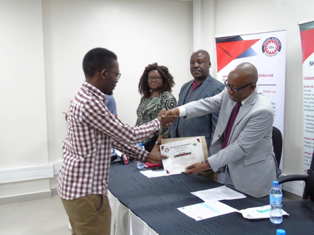 Mkurugenzi Mtendaji wa Shirika la Viwango Tanzania (TBS), Dkt.Athuman Ngenya akiwatunuku vyeti vya ushindi washindi wa shindano la la uandishi insha juu ya maswala ya viwango.