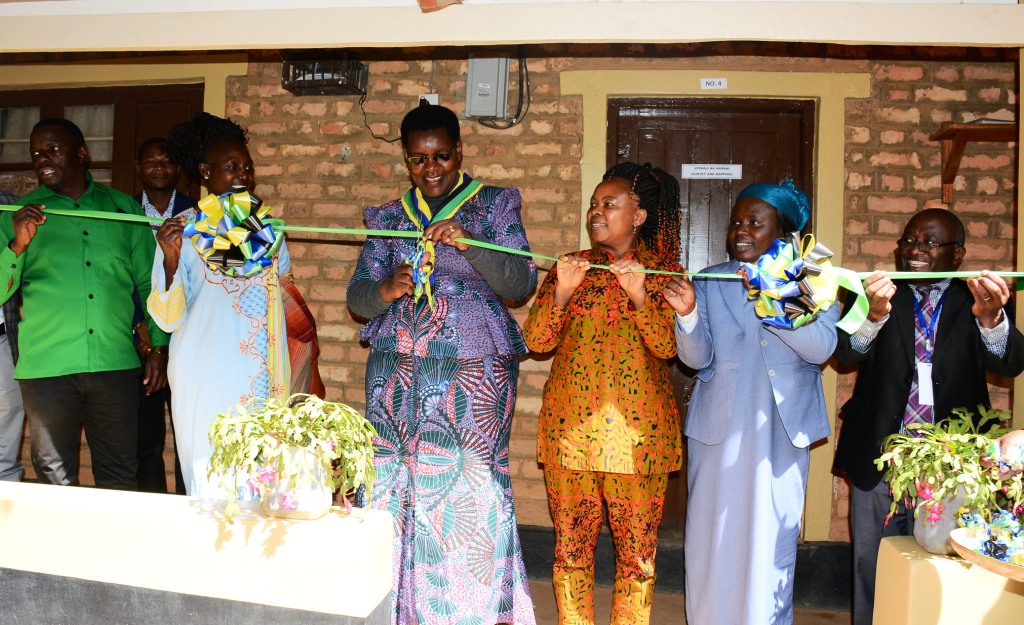 Naibu Waziri wa Ardhi Nyumba na Maendeleo ya Makazi Dkt Angeline Mabula akikata utepe kuzindua rasmi Ofisi ya Ardhi mkoa wa Njombe jana. Wa pili kushoto ni Mkuu wa Wilaya ya Njombe Lucy Msafiri, wa tatu kulia ni katibu Tawala mkoa wa Njombe Catarina Revocatu na kulia ni Kamishna Msaidzi wa Ardhi mkoa wa Njombe Christopher Mwamasage.