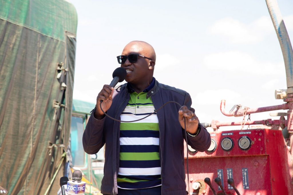 Mbunge wa Dodoma Mjini Mhe. Anthony Mavunde akiwa juu ya mtambo akiwashukuru wananchi wa kijiji cha Mayeto kata ya Hombolo Makulu Wilaya ya Dodoma Mjini Mkoani Dodoma kwa kushirikiana naye ambapo amezindua mradi wa maji kwa ahadi yake na kumaliza tatizo la maji.