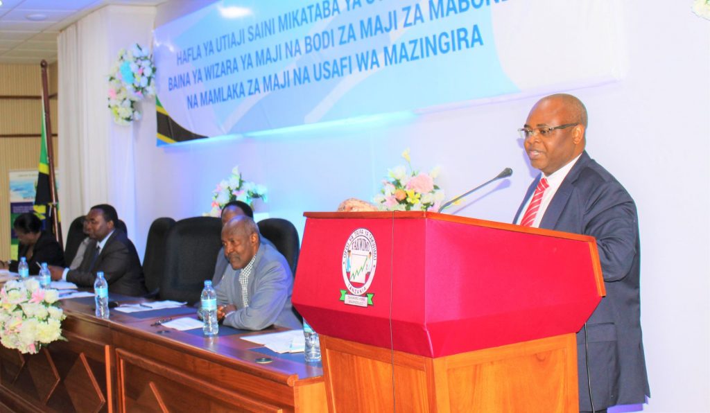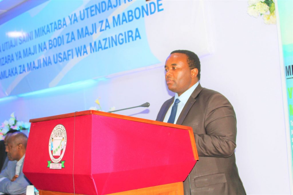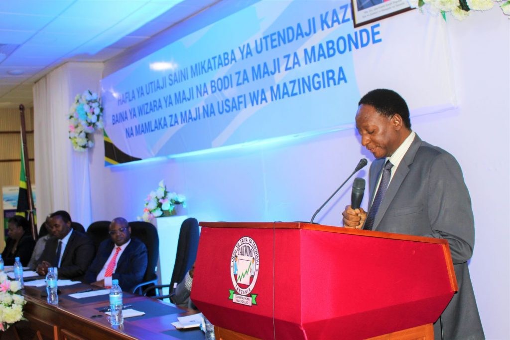 Mkurugenzi wa Usambazaji wa Majisafi na Usafi wa Mazingira Mijini Mhandisi Nadhifa Kemikimba,akizugumza wakati wa hafla ya utiaji saini wa mikataba ya utendaji kazi baina ya Wizara ya maji na Bodi za maji za mabonde na mamlaka za maji safi na mazingira iliyofanyika jijini Dodoma.