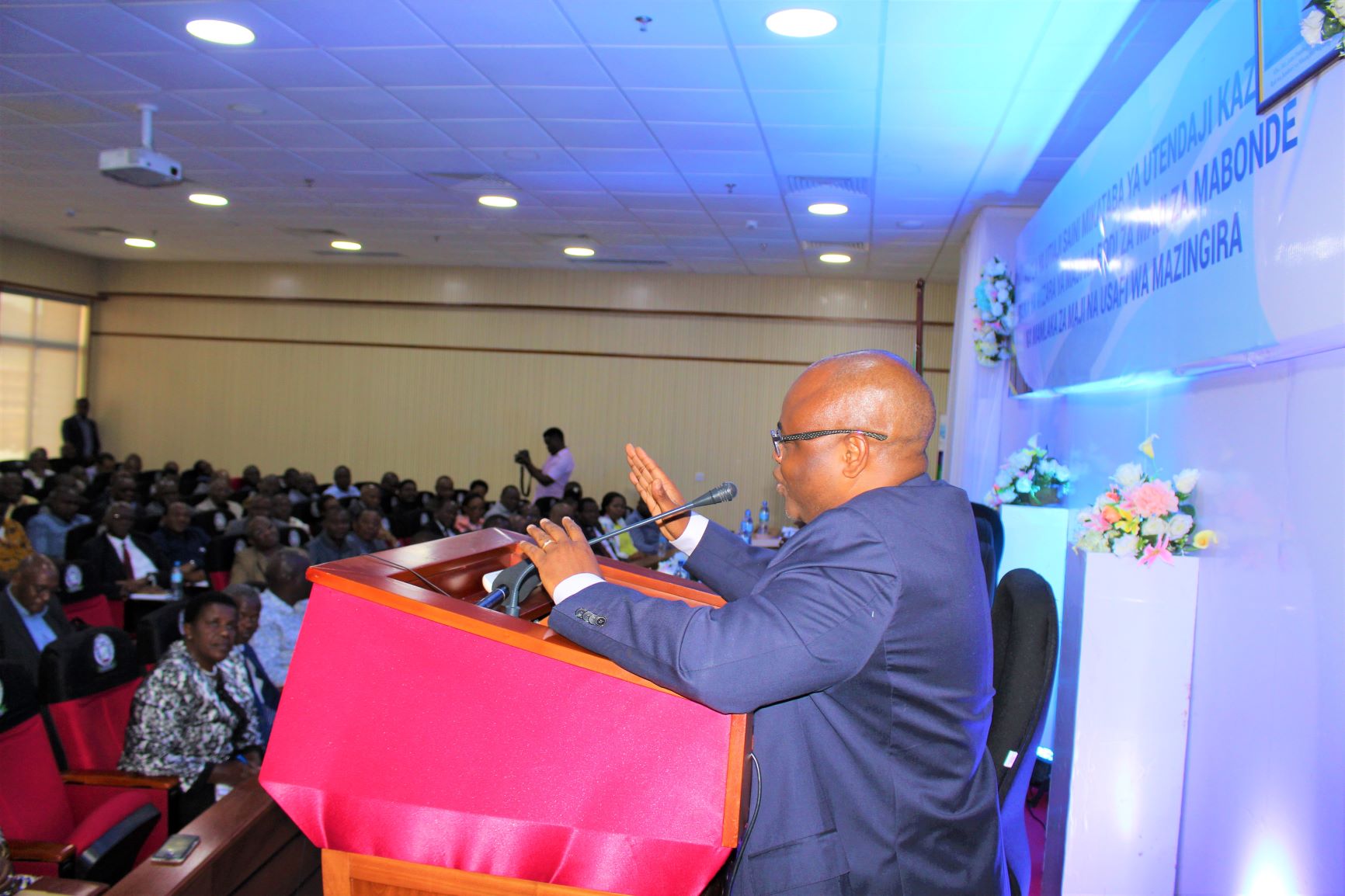 Katibu Mkuu Wizara ya Maji Prof. Kitila Mkumbo akiangalia utiaji saini wa mikataba ya utendaji kazi baina ya Wizara ya maji na Bodi za maji za mabonde na mamlaka za maji safi na mazingira iliyofanyika jijini Dodoma.