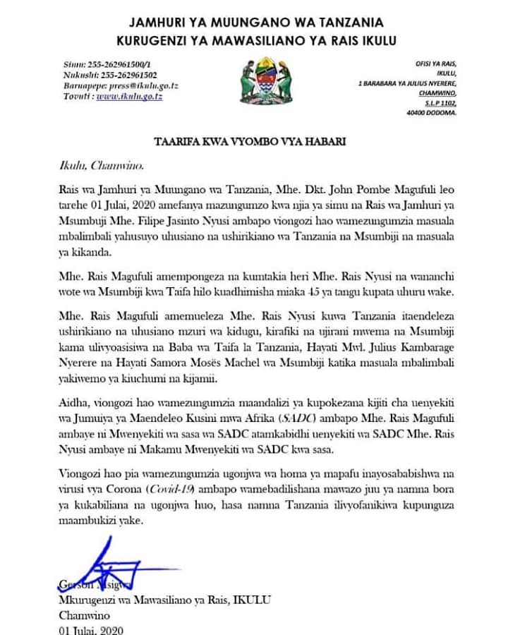 MchanganyikoRAIS DKT.MAGUFULI AFANYA MAZUNGUMZO NA RAIS WA MSUMBIJI KWA SIMU Last updated: 2020/07/01 at 5:02 PM Alex Sonna 5 years ago Share SHARE Alex Sonna July 1, 2020 July 1, 2020 Share this Article Facebook Twitter Email Print Previous Article WAKULIMA JIUNGENI KWENYE VIKUNDI – KUSAYA Next Article TANZANIA YAINGIA KUNDI LA NCHI ZA KIPATO CHA KATI