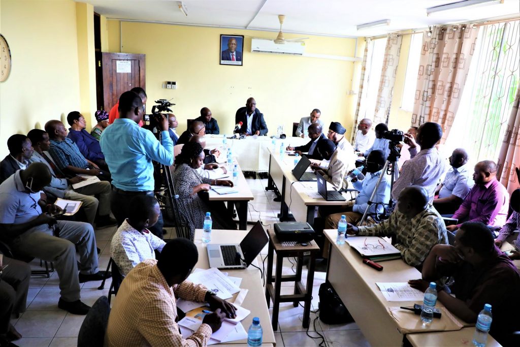 Katibu Mkuu Wizara ya Kilimo Bwana Gerald Kusaya akiongea na Wadau wa zao la Chai pamoja na Wazalishaji wa mbolea mapema leo tarehe 02/07/2020 katika Ofisi za Mamlaka ya Udhibiti wa Mbolea (TFRA) kulia kwa Katibu Mkuu ni Dkt. Stephan Ngailo, Mkurugenzi Mkuu wa Mamlaka ya Udhibiti wa Mbolea nchini