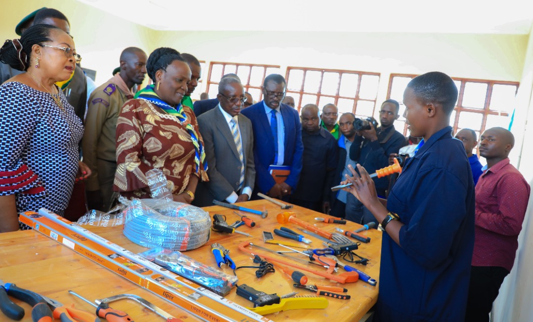 Waziri wa Elimu, Sayansi na Teknolojia Prof. Joyce Ndalichako, Viongozi wa Mkoa wa Songwe na Mamlaka ya Elimu na Mafunzo ya Ufundi Stadi (VETA)wakipata maelezo ya namna ya kutumia vifaa vya umeme kutoka kwa mmoja wa wanafunzi wa Chuo cha Ufundi Stadi Ileje