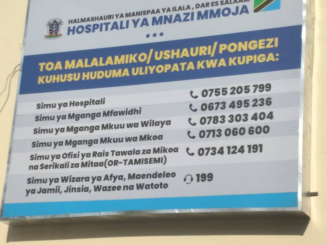 Hospital ya Mnazi Mmoja ya Tekeleza Agizo la Naibu Katibu Mkuu anayeshughulikia maswala ya Afya Ofisi ya Rais, Tawala za Mikoa na Serikali za Mitaa ( TAMISEMI) Dkt. Dorothy Gwajima la kuweka namba za Huduma kwa Wateja ili wananchi kuwasilisha kero na kutatuliwa kwa wakati.