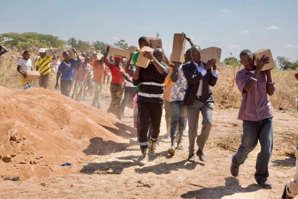 Mbunge wa Jimbo la Dodoma Mjini Anthony Mavunde akiwa na wananchi wa Nkulabi,Kata ya Mpunguzi wakiwa wamebeba matofali kwa ajili ya ujenzi wa Shule ya Sekondari ya Nkulabi ikiwa ni ahadi yake ya kuwajengea shule hiyo ili kuwasaidia wanafunzi.