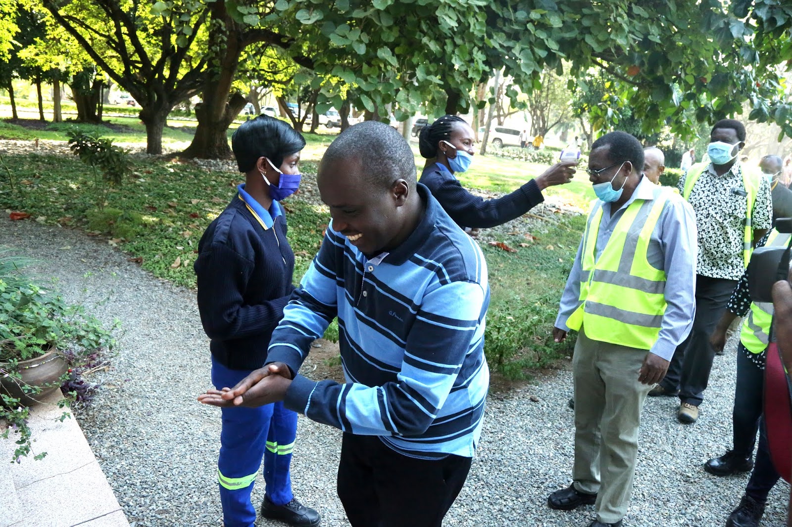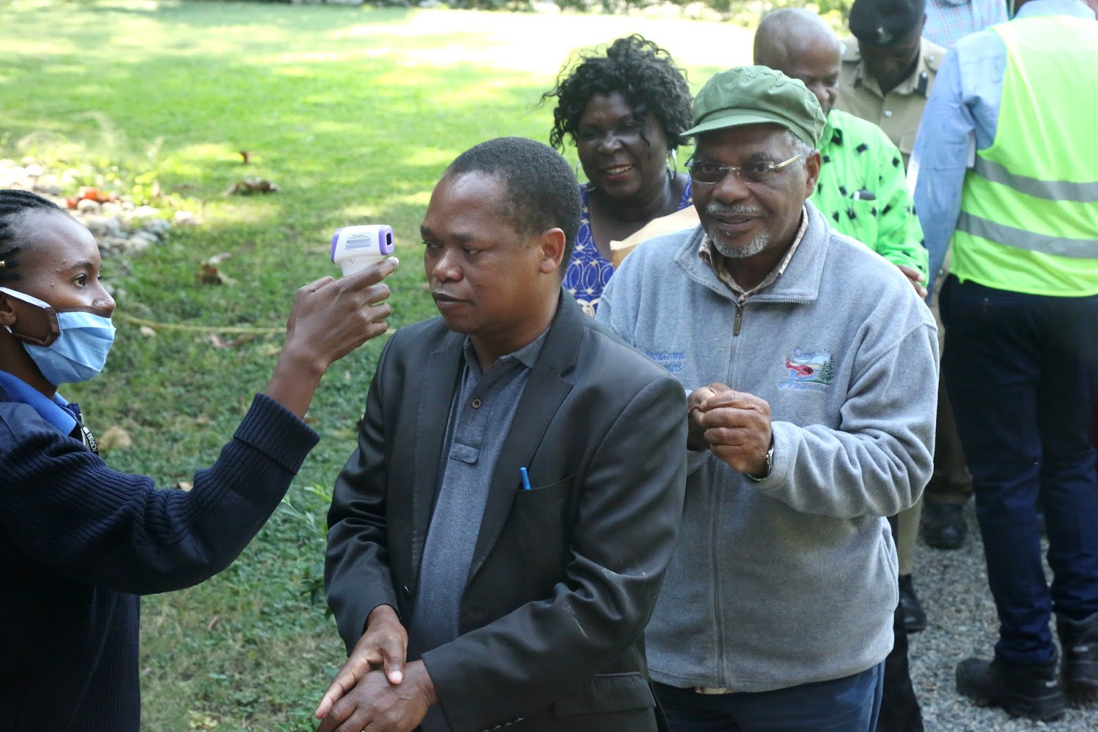 Katibu Mkuu wa Wizara ya Madini Prof. Simon Msanjla akipimwa joto kabla hajaingia kwenye ukumbi wa mkutano katika mgodi wa Williamson Diamond Limited nyuma yake ni Mwenyekiti wa Tume ya Madini Prof. Idris Kikula.