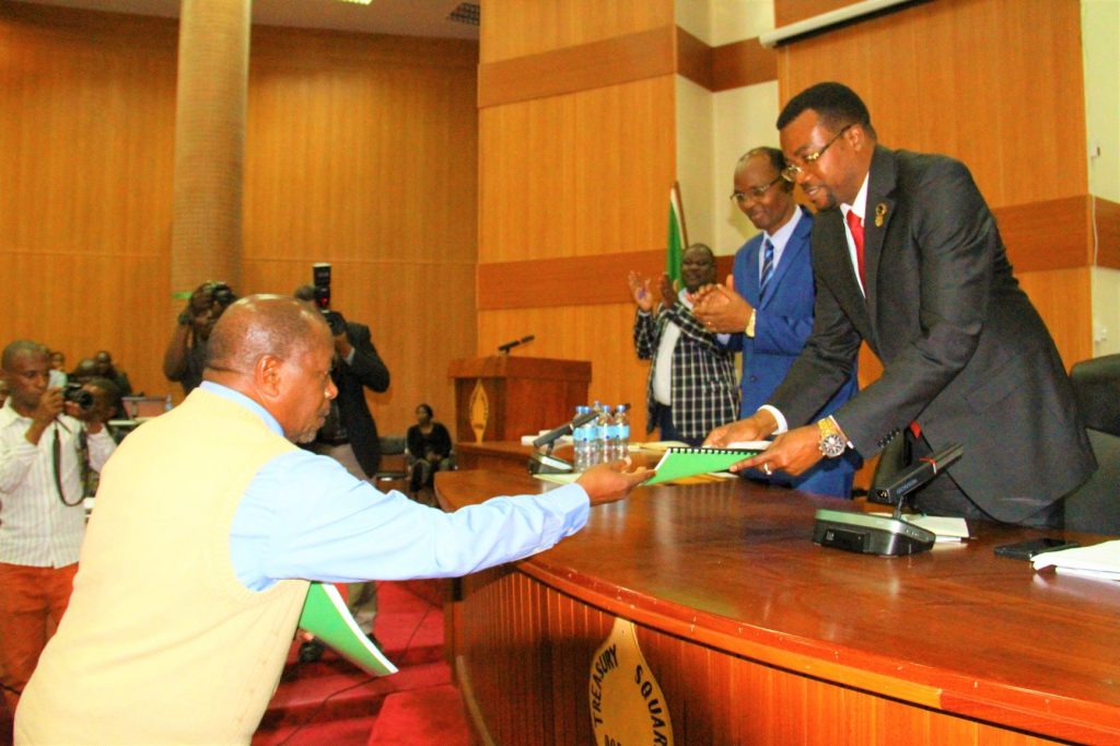 Waziri wa Mifugo na Uvuvi, Mhe. Luhaga Mpina,akipokea taarifa kutoka kwa Mwenyekiti Mstaafu wa LITA Dkt.Jeremiah Haki wakati wa uzinduzi wa Bodi ya Wakala wa Vyuo vya Mafunzo , Bodi ya Hifadhi ya Bahari, Maeneo Tengefu na Bodi ya Baraza la Veterinali iliyofanyika leo jijini Dodoma.