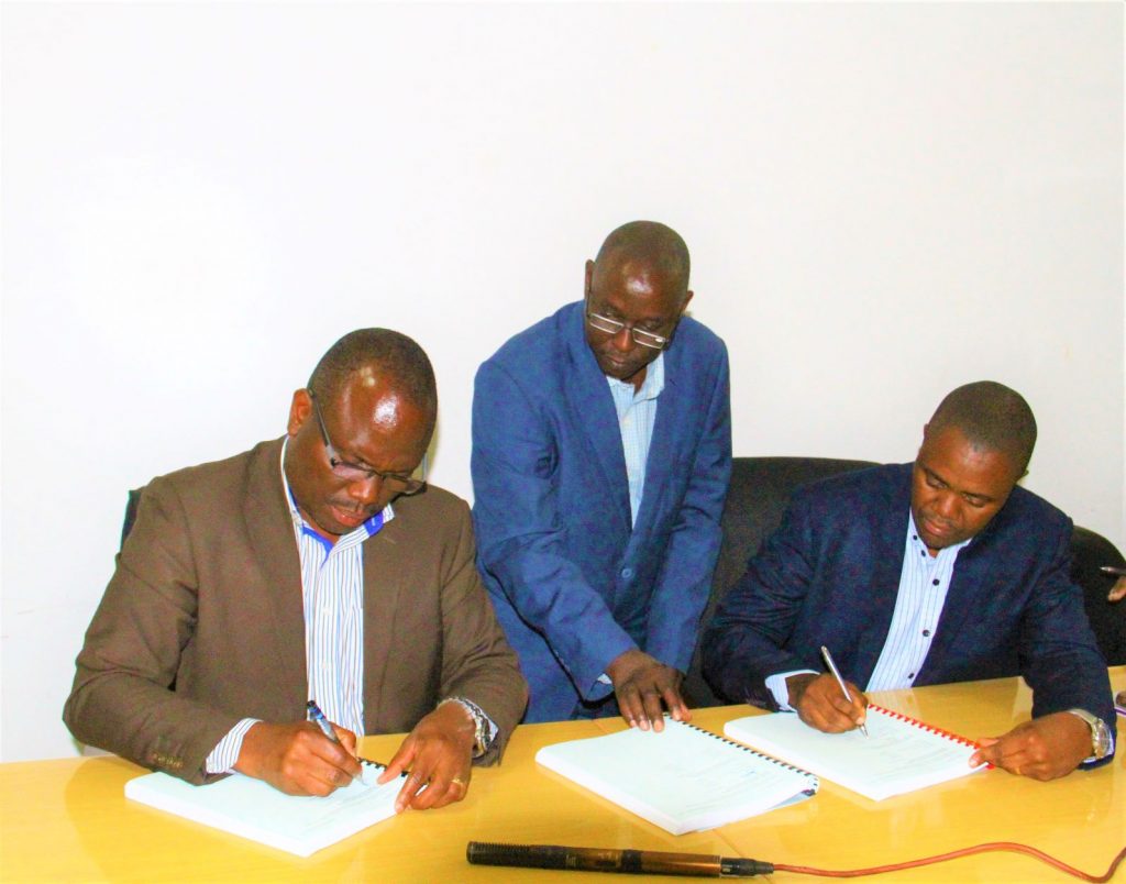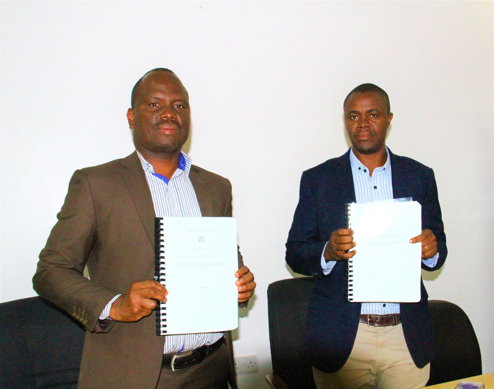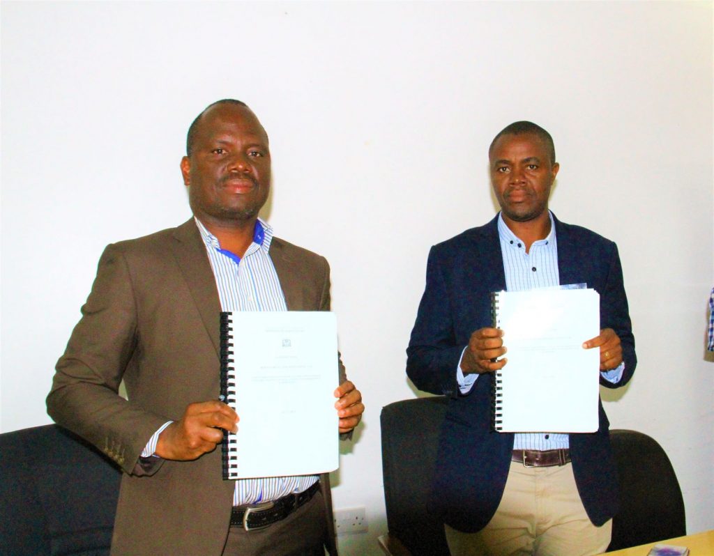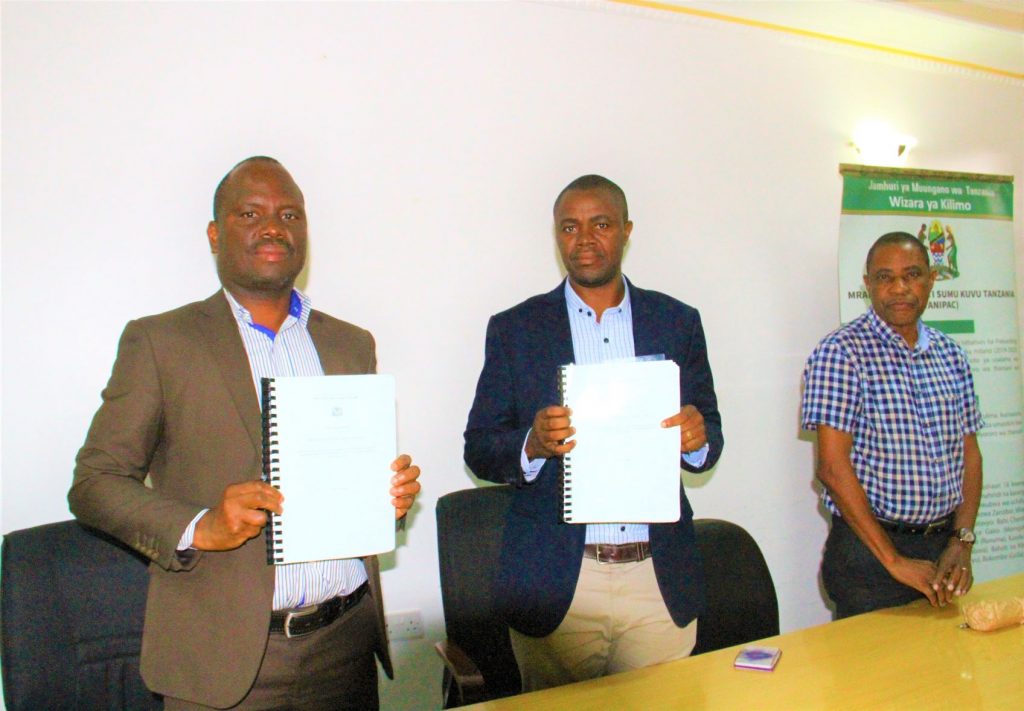 Katibu Mkuu Kilimo Bw. Gerald Kusaya akiwa na Msimamizi wa Mradi wa Ujenzi wa Maabara ya Taifa ya Mazao ya Kilimo, Albert Mwambafu wakionyesha Mkataba mara baada ya kusaini Mradi wa ujenzi wa maabara ya taifa ya mazao ya kilimo inayojengwa Jijini Dodoma