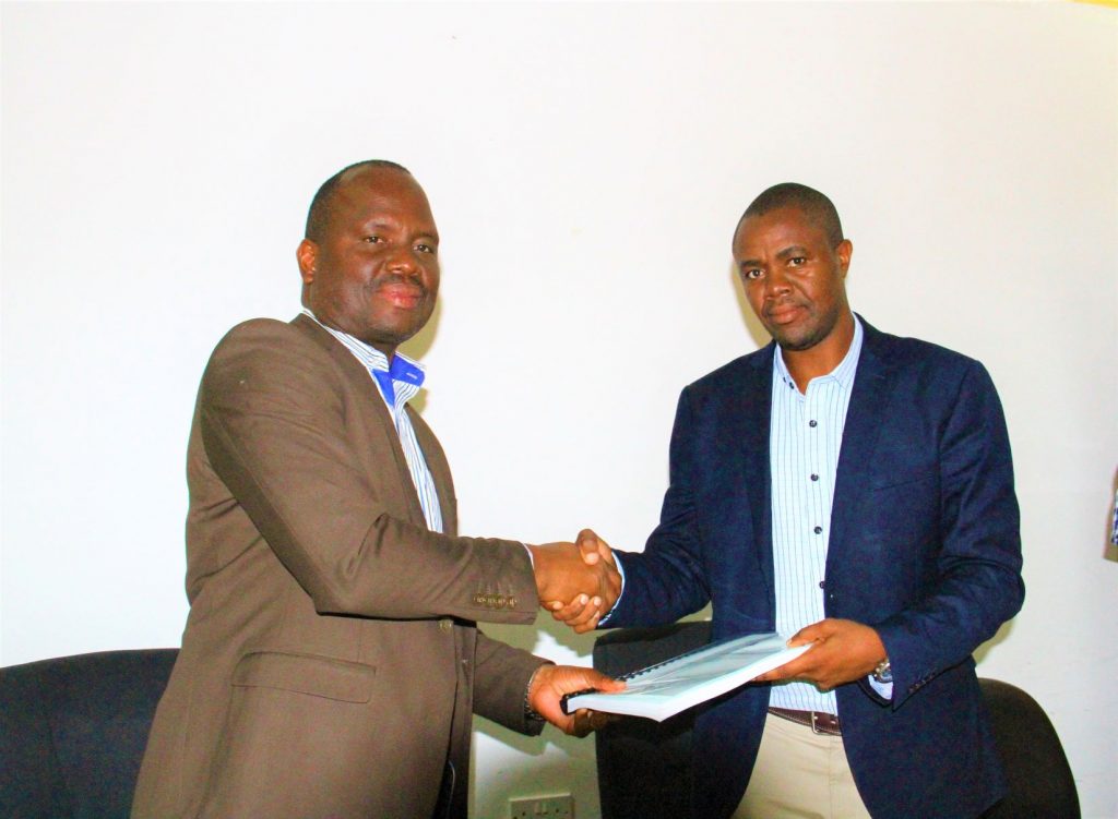 Katibu Mkuu Kilimo Bw. Gerald Kusaya akiwa na Msimamizi wa Mradi wa Ujenzi wa Maabara ya Taifa ya Mazao ya Kilimo, Albert Mwambafu wakibadilishana Mkataba mara baada ya kusaini Mradi wa ujenzi wa maabara ya taifa ya mazao ya kilimo inayojengwa Jijini Dodoma