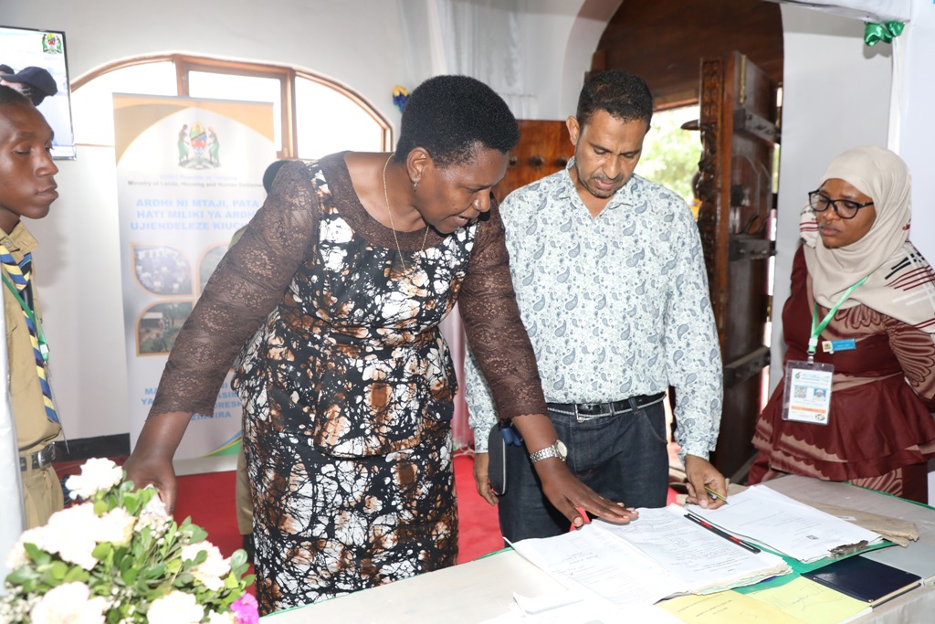 Naibu Waziri wa Ardhi Nyumba na Maendeleo ya Makazi, Dkt. Angeline Mabula akikagua taarifa za mteja aliyeleta malalamiko katika viwanja vya sabasaba jijini Dar es Salaam.