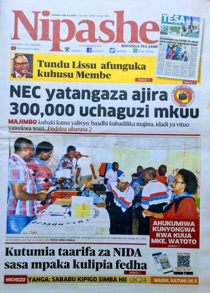 MagazetiPITIA VICHWA VYA HABARI KATIKA MAGAZETI YA LEO JULY 14,2020 Last updated: 2020/07/14 at 3:23 AM Alex Sonna 6 years ago Share SHARE \ Alex Sonna July 14, 2020 July 14, 2020 Share this Article Facebook Twitter Email Print Previous Article WCF YATWAA TUZO YA MSHINDI WAKWANZA KUNDI LA TAASISI ZA BIMA NA MIFUKO YA HIFADHI YA JAMII MAONESHO YA 44 YA SABASABA Next Article VIONGOZI WA KIISLAMU LETENI MAENDELEO MNAPOPATA NAFASI
