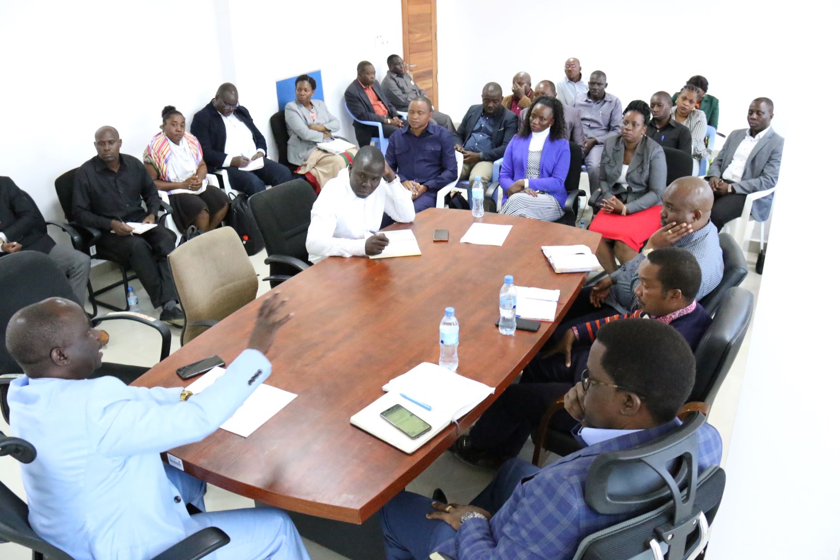 Watumishi katika Ofisi ya Tume ya Uchaguzi (NEC) wakimsikiliza Murugenzi wa Uchaguzi wa NEC, Dk. Wilson Mahera (hayupo pichani) wakati akizungumza na watumishi waliohamia kwa awamu ya kwanza katika ofisi mpya za Makao Makuu tume yaliyopo Njedengwa Jijini Dodoma jana. (Picha na NEC)