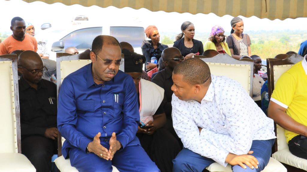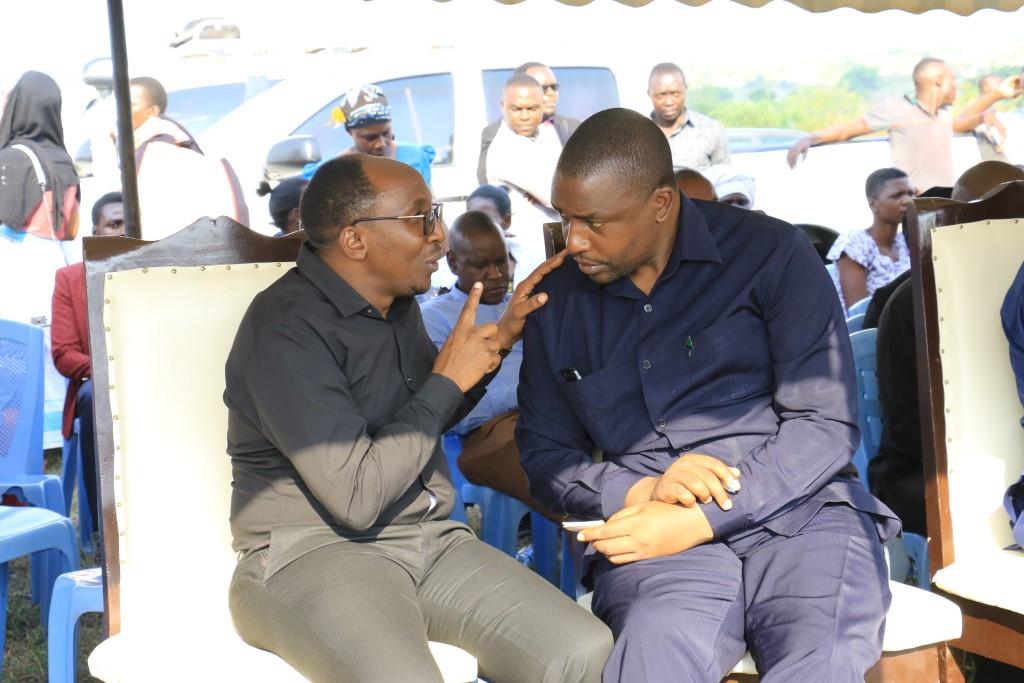 Mkuu wa Wilaya ya Temeke, Mhe. Godwin Gondwe ambaye pia aliwahi kuwa mkuu wa wilaya ya Handeni, akiteta jambo na Mkuu wa Wilaya ya Handeni, Mhe. Toba Nguvila wakati wa mazishi ya aliyekuwa Katibu Tawala wa Wilaya ya Handeni mkoani Tanga, Bw. Boniphace Maiga Juma ambaye alifariki kwa ajali ya gari Julai 11,2020, baada ya mazishi yake yaliyofanyika kijiji cha Lyamisanga wilayani Butiama mkoani Mara
